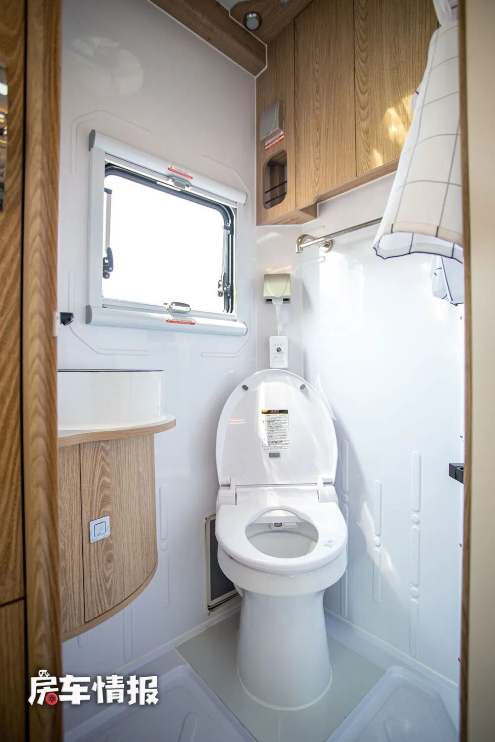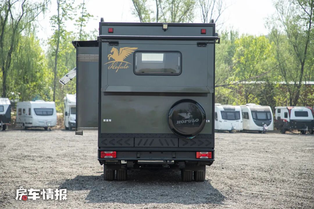 因为较高的车身,这款车是配置了电动的遮阳棚,下方带有一台抽拉的柴油灶和外置的淋浴花洒,另外后方还有一个贯通式的储物舱方便存放一些大件的行李。