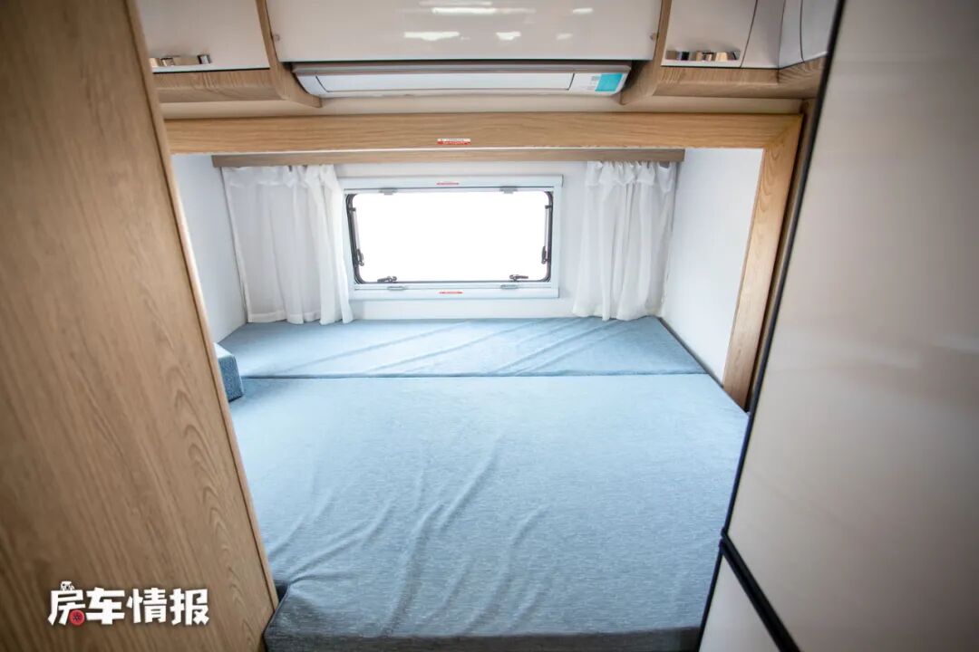 位于车厢尾部则是一张横置的双人床,由于带有后拓展的设计,所以床铺的尺寸表现的也不错,最长处为2200mm,最宽处可以达到1550mm,睡一家三口也是可以的。