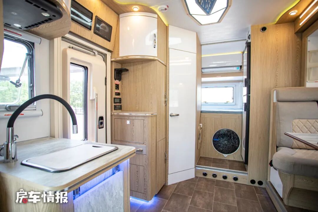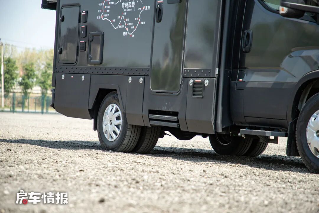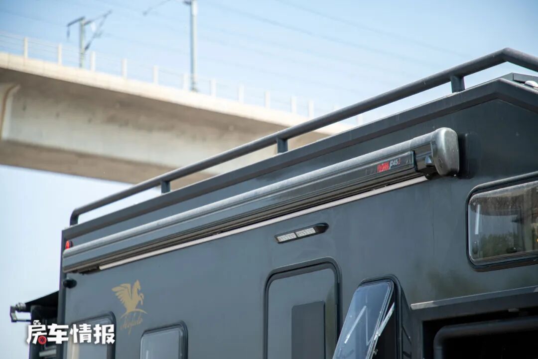 全车采用了全铝材质的箱体,下方也带有铝制裙边,而且都带有储物舱,这个设计和我们之前视频介绍过的很多国外重卡房车的设计非常类似。