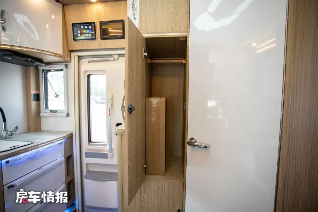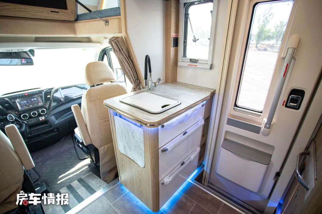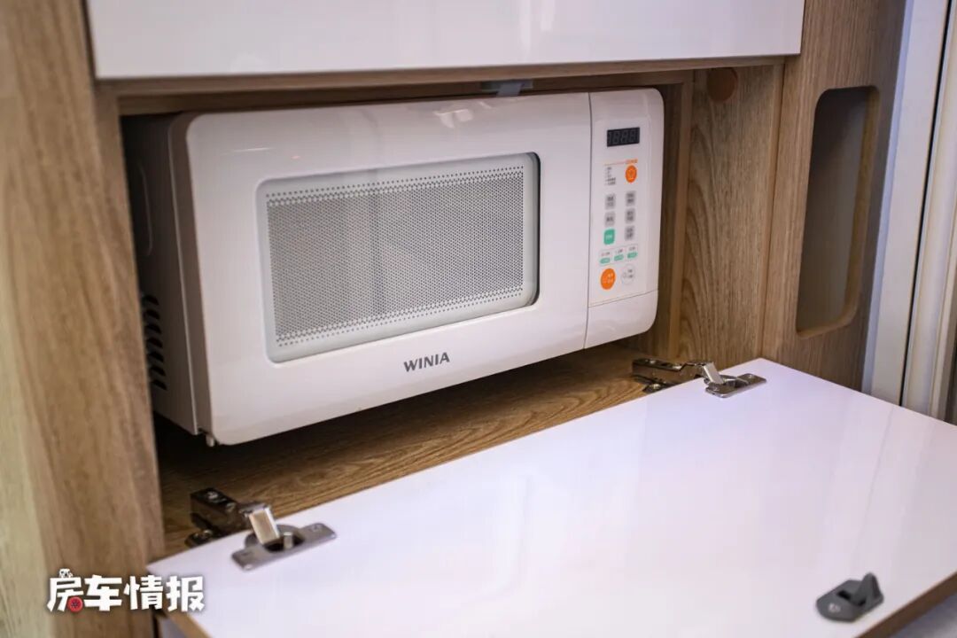 和我们常见的设计不同的是,整辆车的厨房主操作台位于乘客门的前方,尺寸并不是很大,因为车外配置了灶台,所以台面上只带有一个基础的不锈钢水槽,顶部配置了抽油烟机,侧面提供了拓展桌板,下方是隐藏了一台微波炉以及储物的抽屉,如果后期搭配上便携式的电磁炉或者卡式炉,也可以实现在车内进行烹饪的需求。