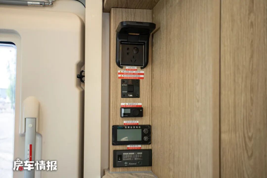水电路上,这款车的配置可以说比较充沛了,电路上不仅提供了一台发电机,还搭载了一台24V 3000W的逆变器,并且提供了24V 600Ah的锂电池,相当于14.4度电,顶部还配置了800W的太阳能电池板;水路上则拥有300L的净水箱和110L的灰水箱,足够满足日常的用水用电需求。另外全车还配置了柴油暖风热水一体机和一台40L的电热水器。