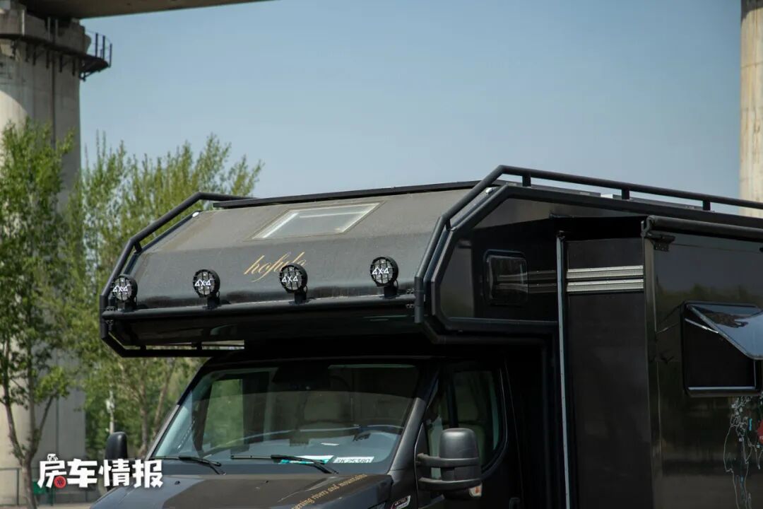 这款由中汽亿达和霍夫勒合作推出的基于6.5吨进口依维柯New Daily底盘所打造的双拓展车型黑金刚,听这个名字就感觉够霸气,确实也是车如其名,整辆车外部都采用了熏黑的处理,全黑的喷涂在国内的车型上还是很少见的,车头前方加入了防撞梁的设计,顶部还配置了越野探照灯,车厢顶部也有防护栏的加入,纵观整辆车的外观,多了非常浓厚的越野感觉。