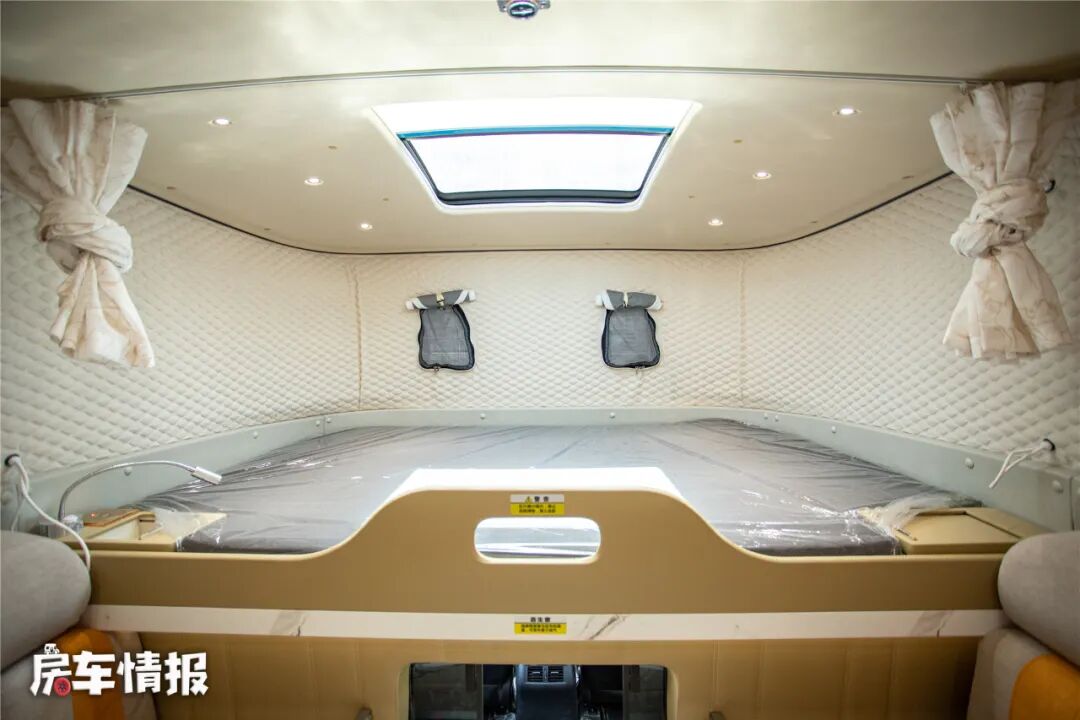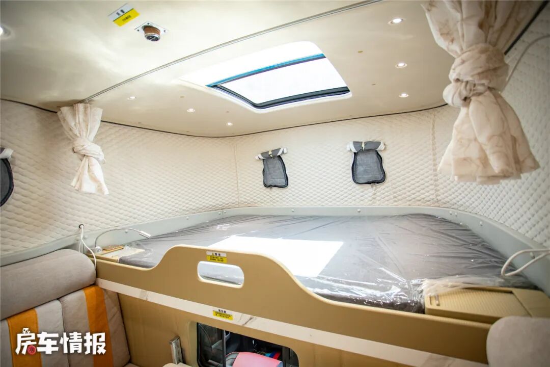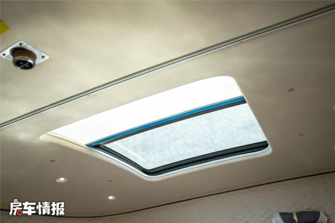 床铺上方提供了一部家用车上使用的全景天窗,开启方式和普通车上的完全一致,既可以选择只打开遮光帘的天幕模式,也可以完全打开进行通风换气,需要注意的是行车时这个天窗是不可以开启的。