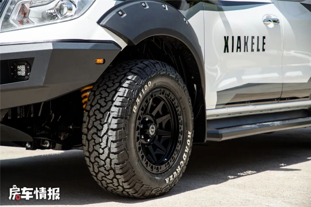 车头两侧的轮圈上方也加入了防剐蹭的黑色轮眉,一旦发生剐蹭,后期更换的成本也会更低,轮眉下方则是换装了四条全地形越野轮胎,不仅增加了轮胎与地面的接触面积,同时更强壮的胎壁和更硬的胶粒,也可以在户外穿越的时候防止尖锐物品将轮胎刺破。