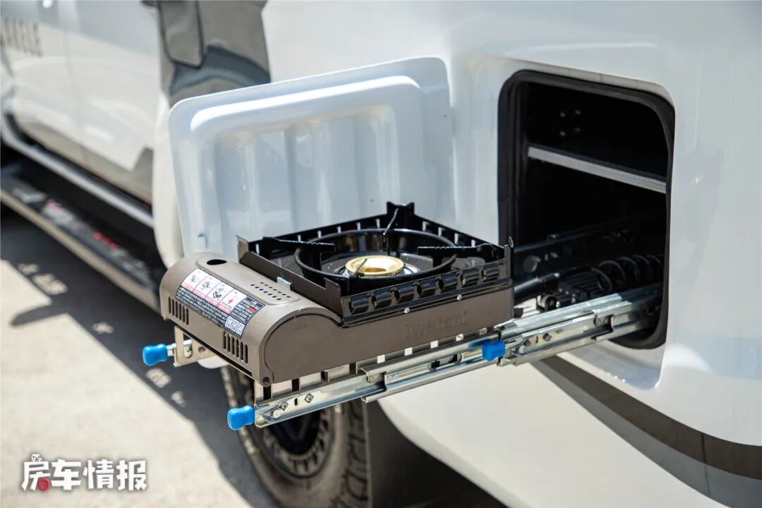 想要做饭的话,车厢外部提供了一个抽拉式灶台,这款车选用的是卡式炉,后期也可以自己备一套便携式的液化气灶,可以根据自己所去的目的地和使用习惯进行酌情选择。