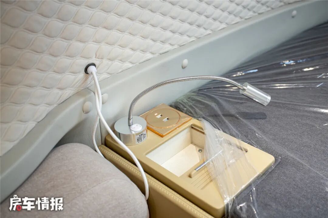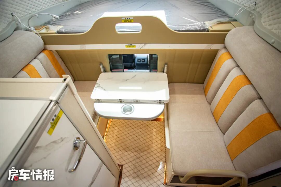 内部的整体设计风格比较温馨居家,和外部粗犷的硬派风格形一个反差萌。车厢前方是一张尺寸达到了1950*1260mm的双人床,睡下两名成年人或再加上一个小朋友也没有问题。