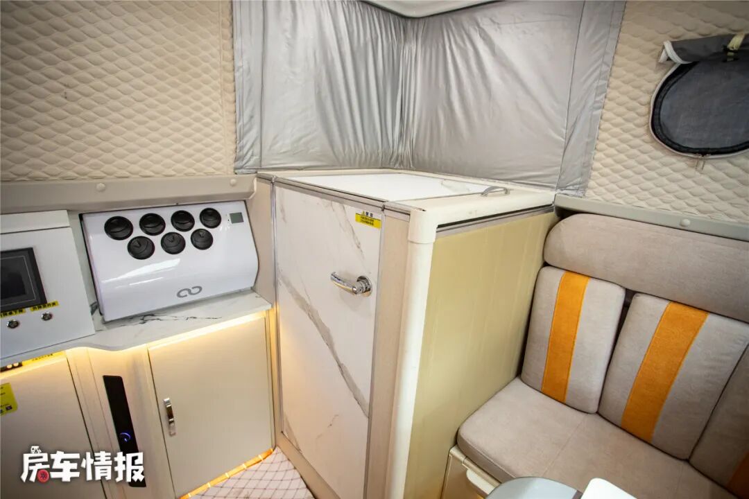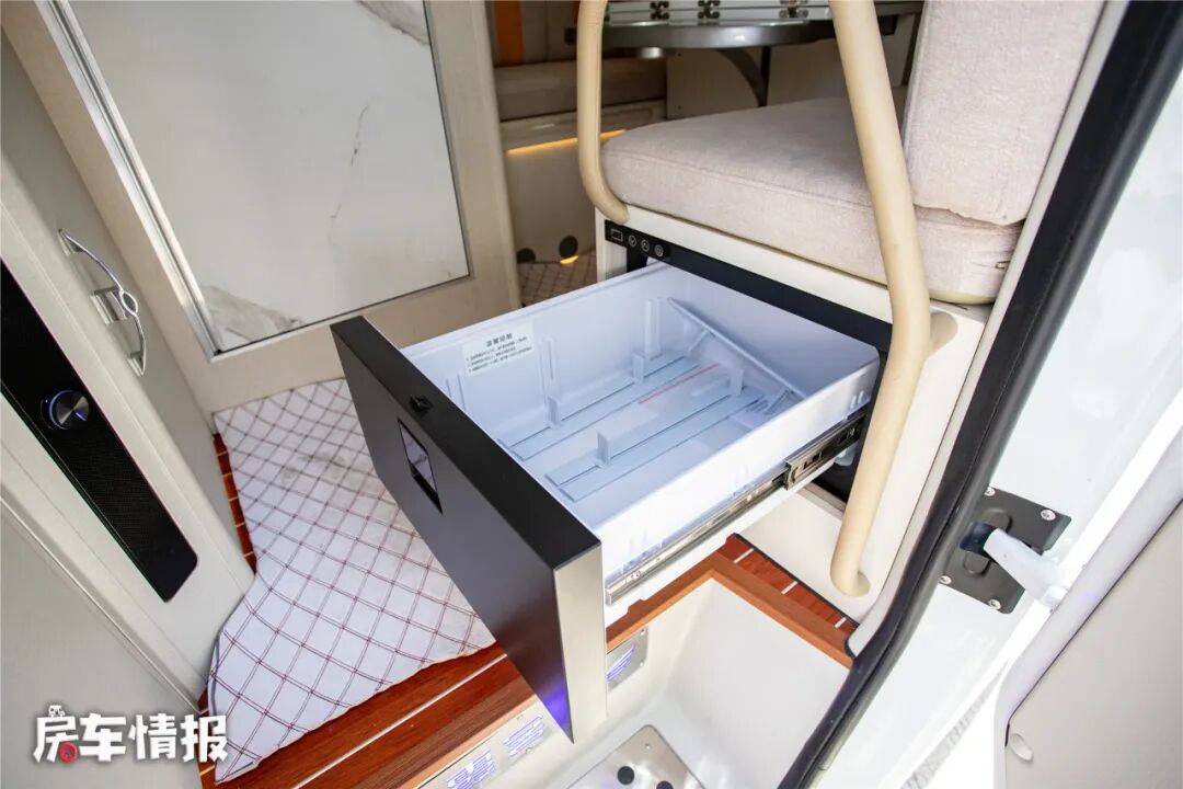 车厢后方还提供了一台24V变频空调,可以改善车内的温度状况,提升舒适度,位于座椅下方还提供了一台30L的抽屉式车载冰箱,旅行中也可以把一些食材或饮料存在里边。搭配这款车自带的6度电,基本上不用担心用电问题。