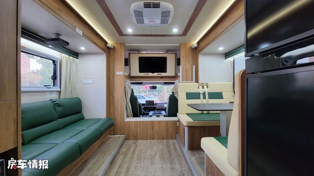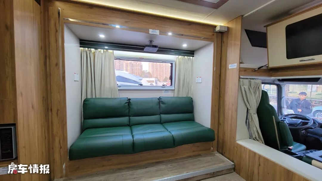 车内的装修风格更为质朴简约,木质家具中点缀了绿色的皮艺沙发,使整体氛围更加的温馨。