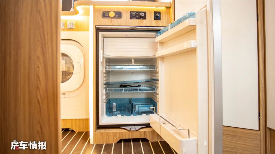 靠近乘客门处的厨房操作台则提供了基础的水槽和电磁炉,在乘客门的前方则是放置了一台224L上下双开门的冰箱,可以满足日常分类存放食材的需求。