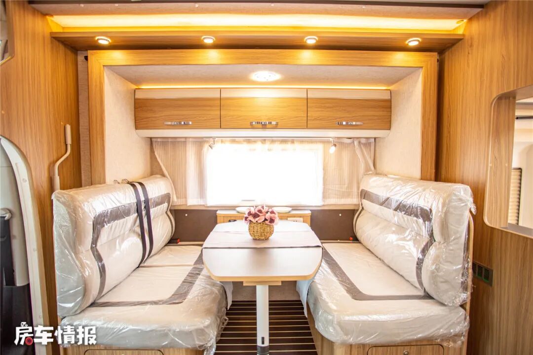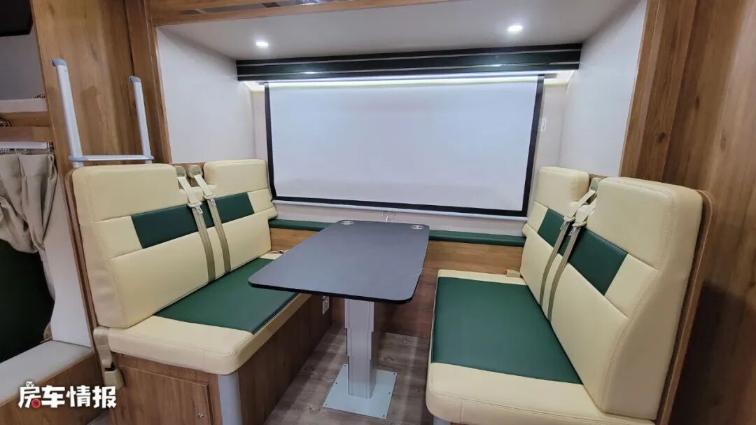 另外一侧的拓展舱内则是经典的四人对卡座+餐桌的设计,并配置了四条安全带,日常行车也可以满足乘坐,晚上的时候也可以变成沙发床用来休息睡觉。