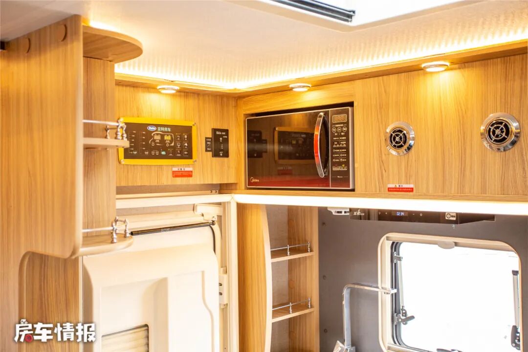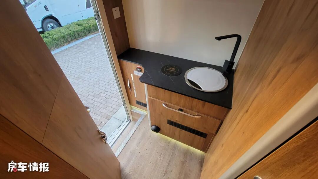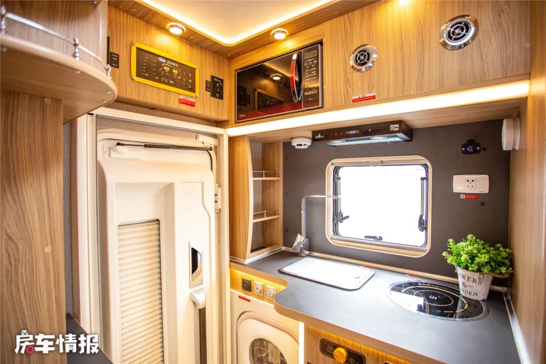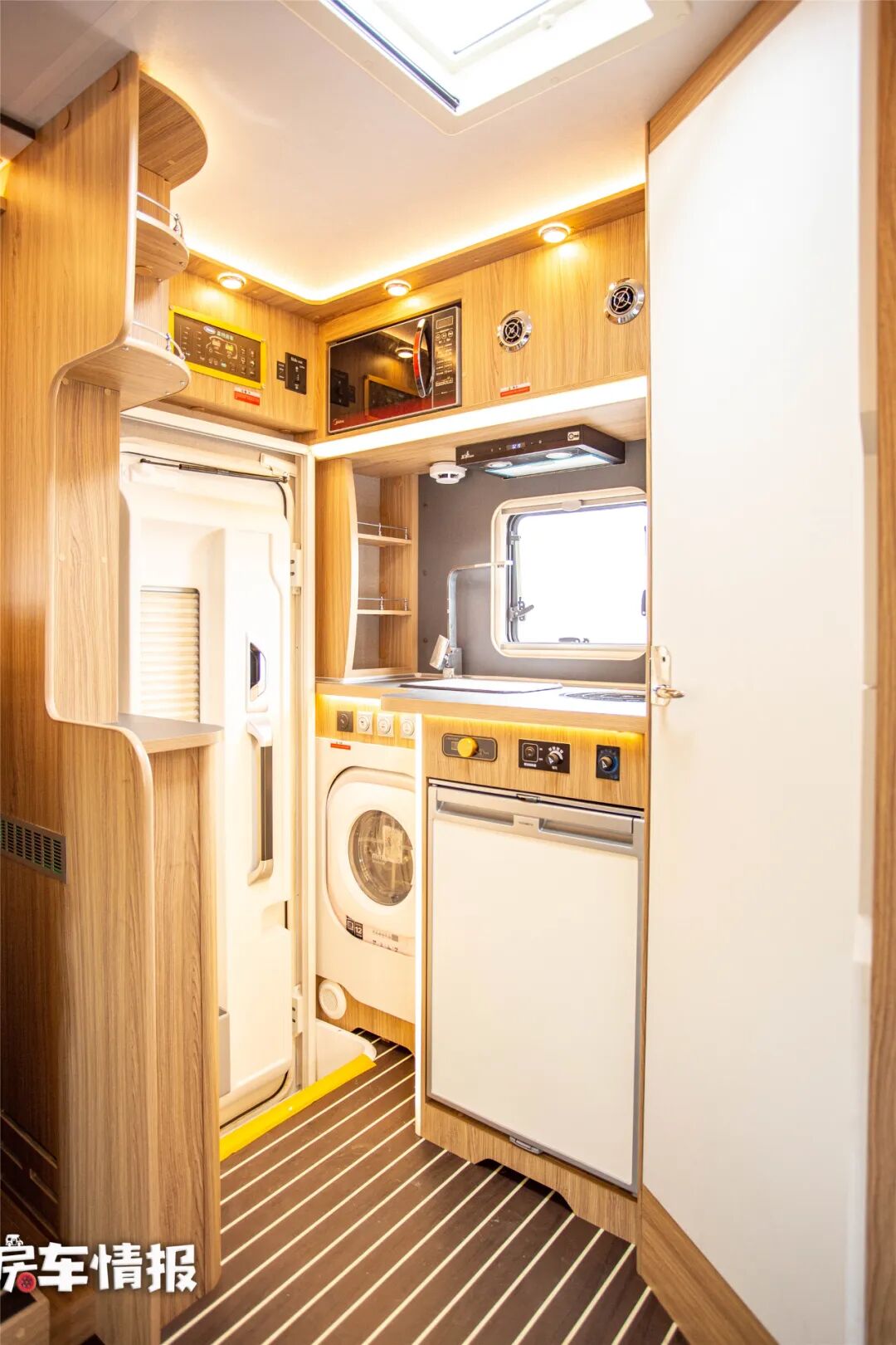 整车的厨卫区位于车厢的尾部,整体的配置还是比较齐全的,靠近乘客门的厨房操作台是提供了电磁炉、不锈钢水槽、抽油烟机、微波炉、车载冰箱和洗衣机,可以满足日常的烹饪需求。