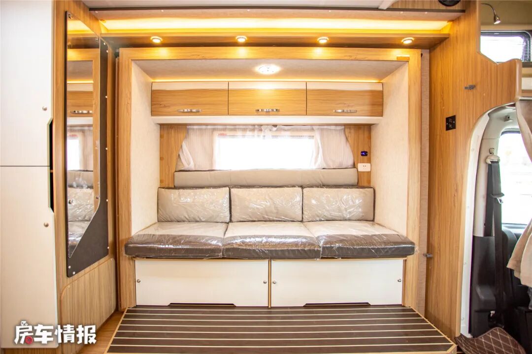 车内的整体布局依然采用了我们在单拓展车型中常见的设计,左侧拓展舱内是一张长条的沙发,驻车时可乘坐,晚上则可以拓展成沙发床,顶部也提供了基础的吊柜方便用来储物。