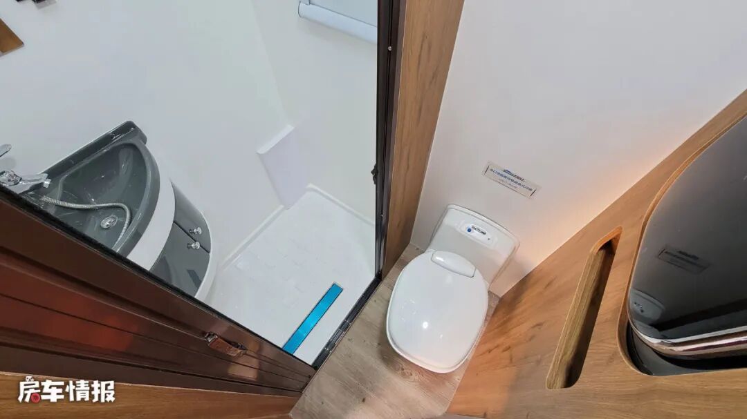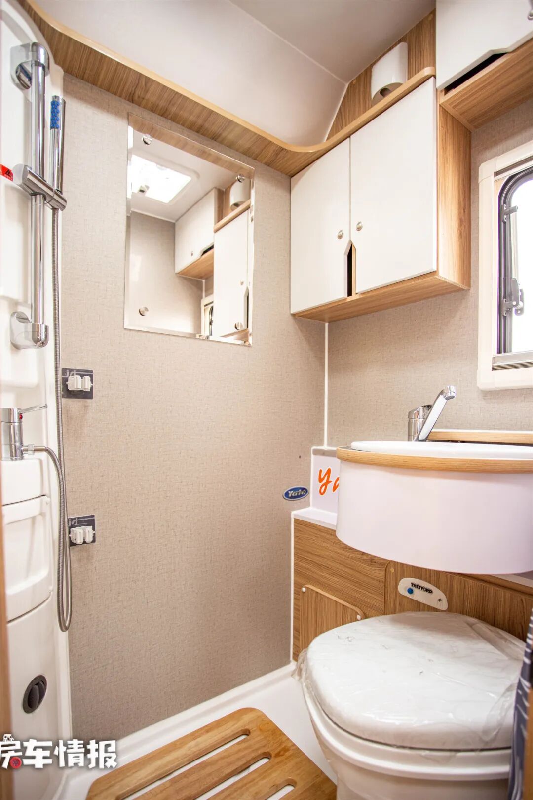 而靠近最里侧的则是全车的独立卫浴室,内部提供了比较齐全的洗漱设施,包括梳妆镜、淋浴花洒、马桶、洗手台、储物柜、换气扇等,可以满足出行的洗漱需求。