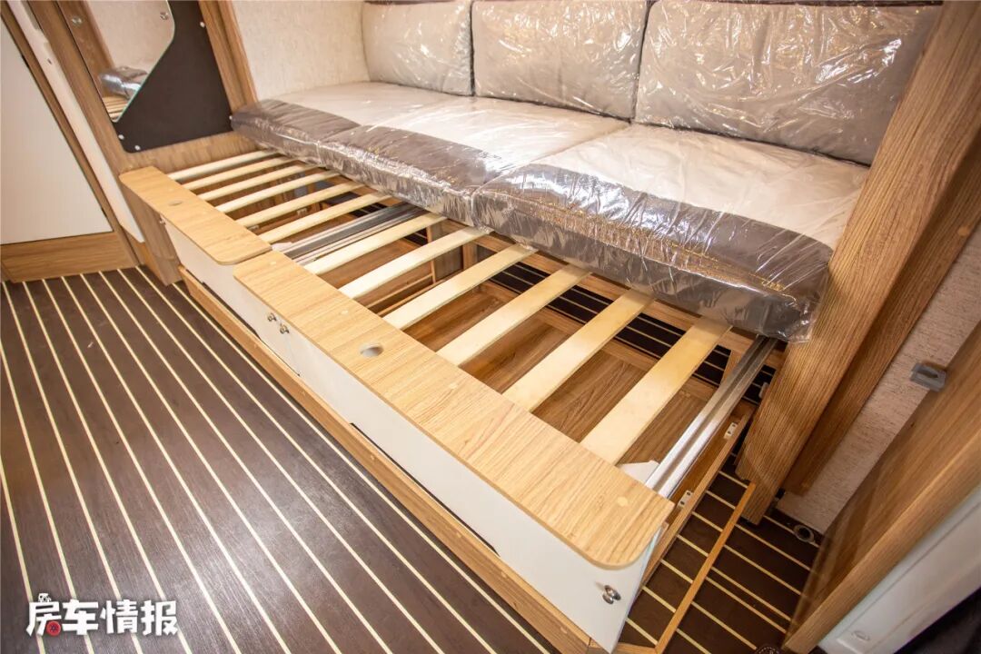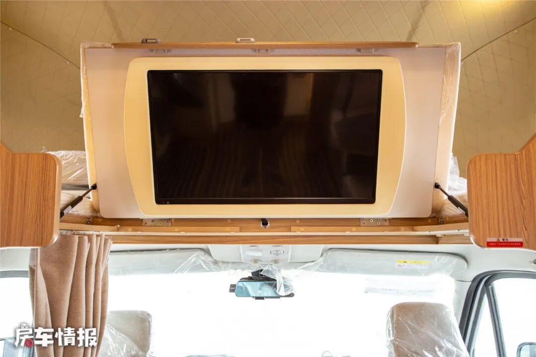 除去两个拓展舱内可变的沙发床之外,在最前方驾驶室顶部的额头区域内,还标配了一张尺寸为2200*1470mm的额头床,能够满足两个成年人的睡眠需求,床板下方则提供了一台32寸的液晶电视。