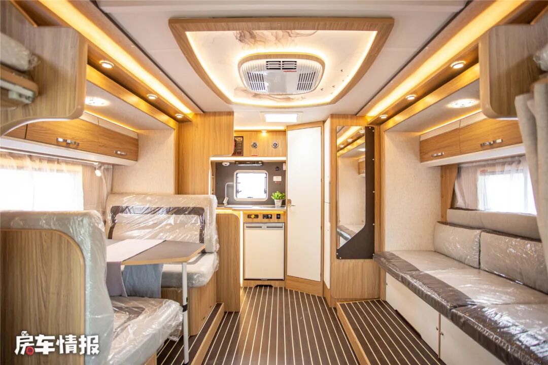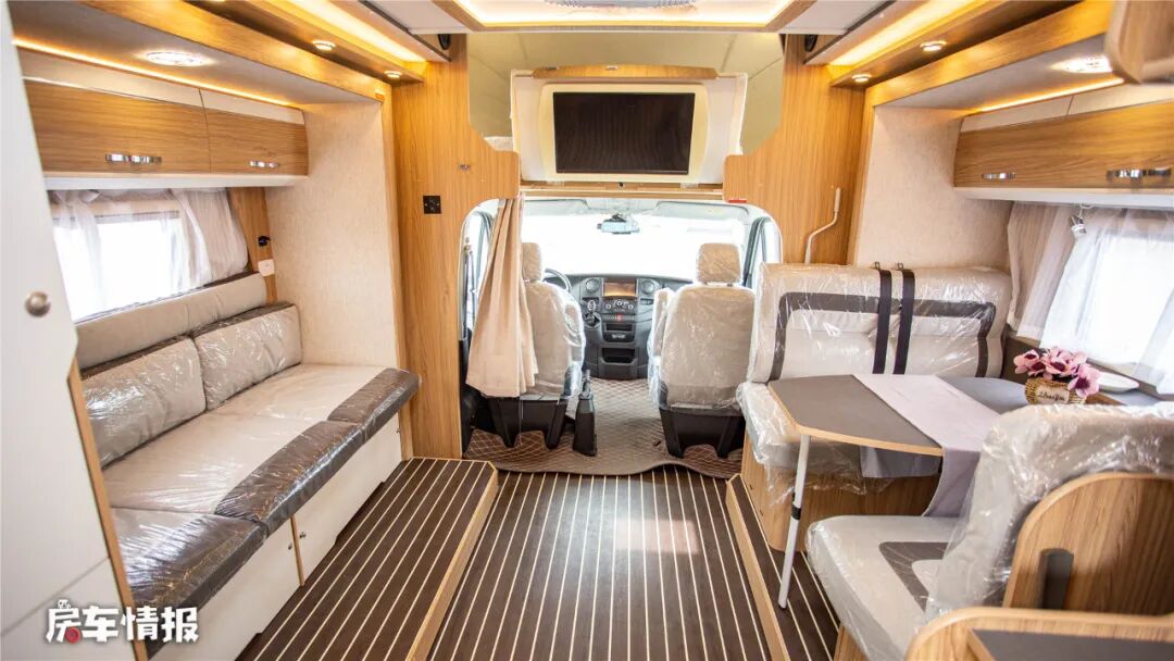 车厢内部和前一款亚特DT的布局相差不多,中部为主要的会客就餐区域,左侧是长条沙发,行车时不可乘坐,夜晚则可以拓展成床。