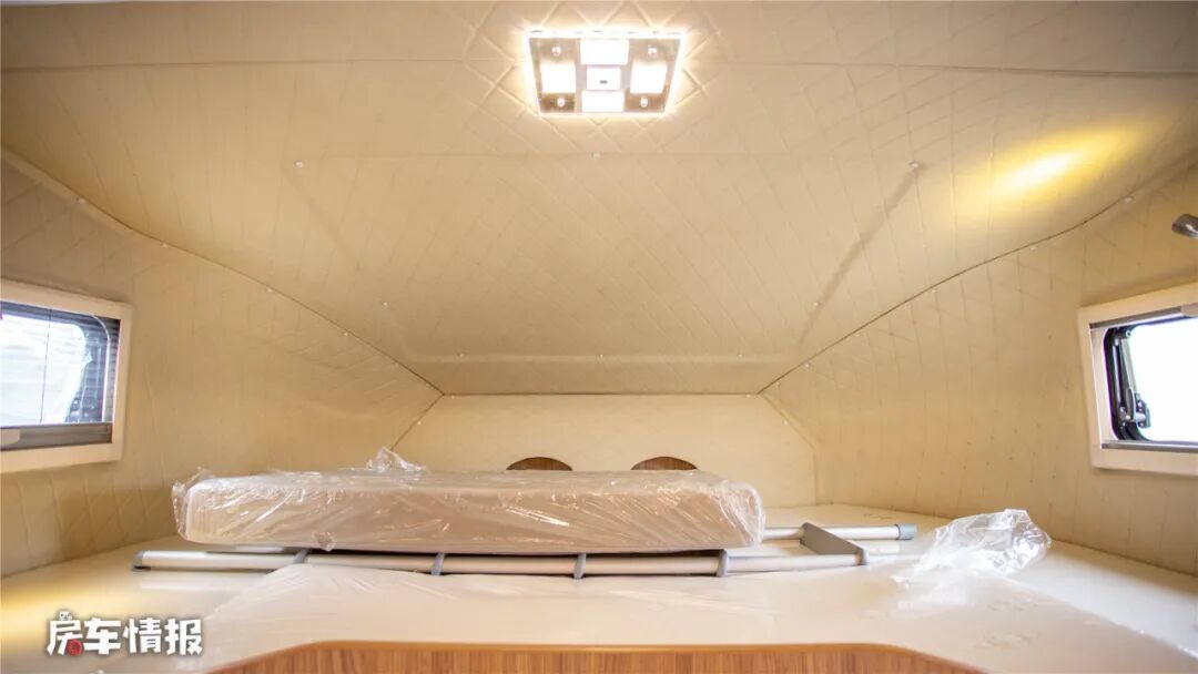 最前方驾驶室上方的额头区域内,依然标配了一张额头床,尺寸为2100*1500mm,得益于平头的设计,从内到外整体的高度都基本保持一致,所以空间上也还不错,顶部还配置了一扇小型的天窗,可以为此区域带来不错的采光度。除去刚才我们所说的幕布,床板下方也提供了一台32寸的液晶电视,平时可以按需选择观看。