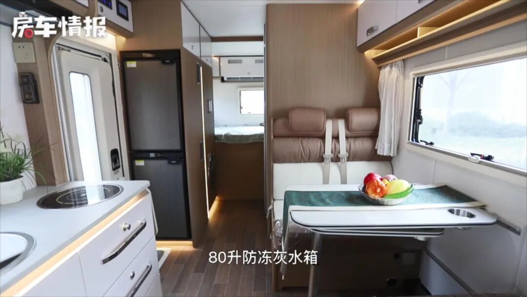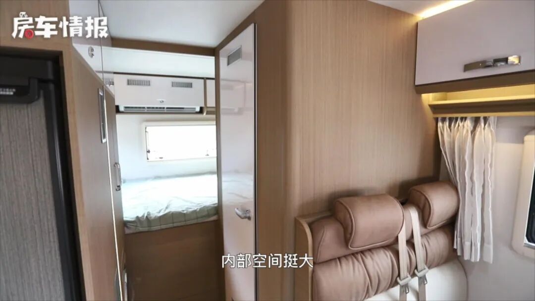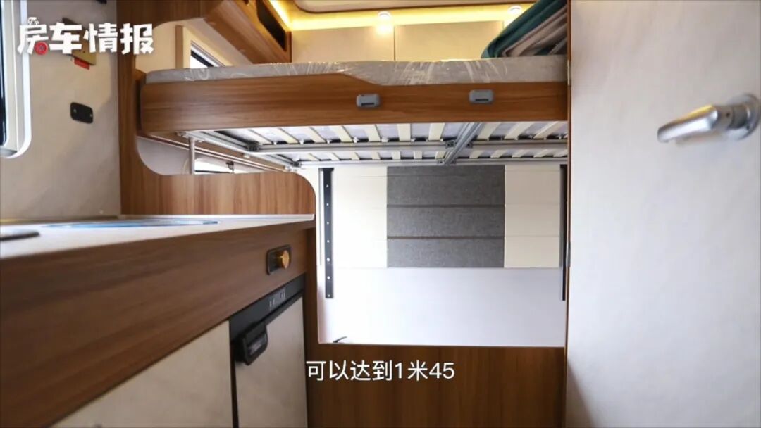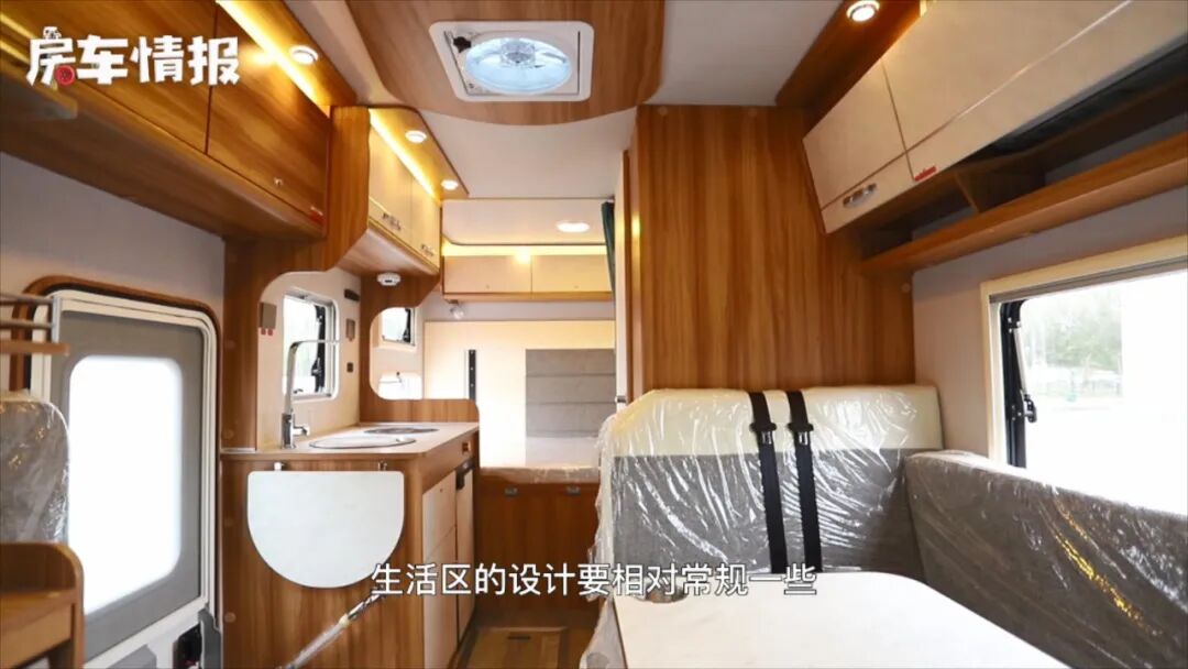 车内有两个休息区,第一个是车尾横置双人床,尺寸约为2000*1400mm,第二个则是驾驶室顶部的额头床,尺寸同样为2000*1400mmm,加上前方的沙发床,可以轻松满足5口人居住。