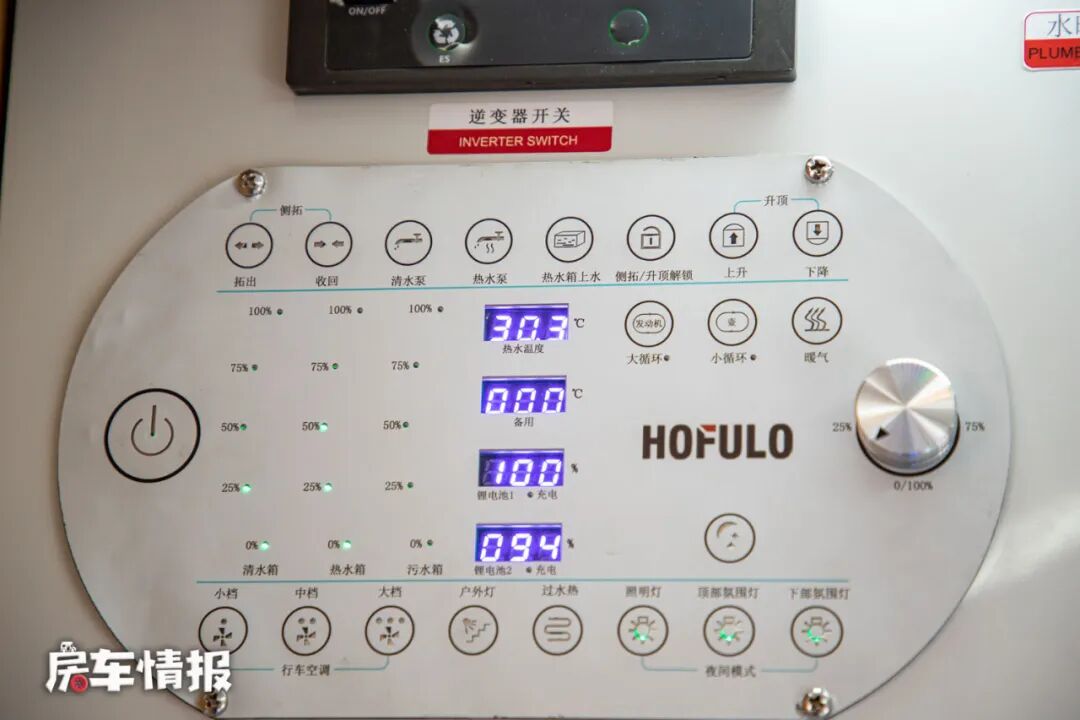 而车内的水路系统是隐藏在地板下方的,还带有80L的热水箱,即便在冬天也能够正常的使用,另外车内的水电面板也是采用了最新薄膜开关的设计,不仅能够显示热水箱的温度,还提供了独立的开关,通过开关就可以直接打开热水泵进行抽水,也可以从清水箱内抽水使用,而这套热水系统和全车的水路系统是分开的,水路上这款车是拥有230L的清水箱和95L的污水箱。