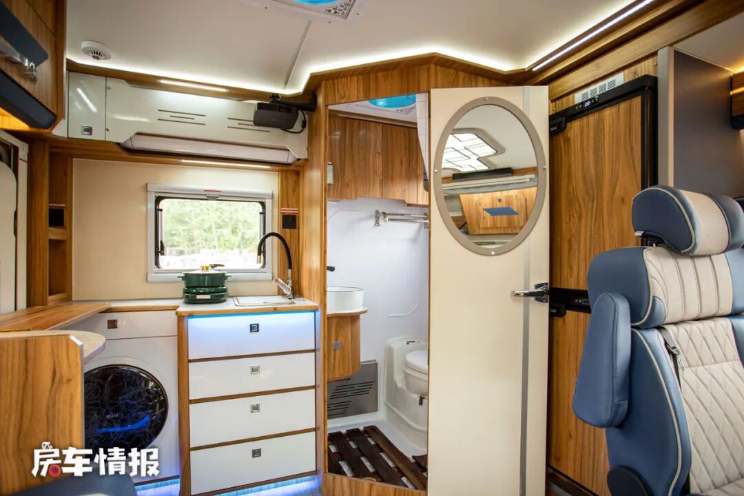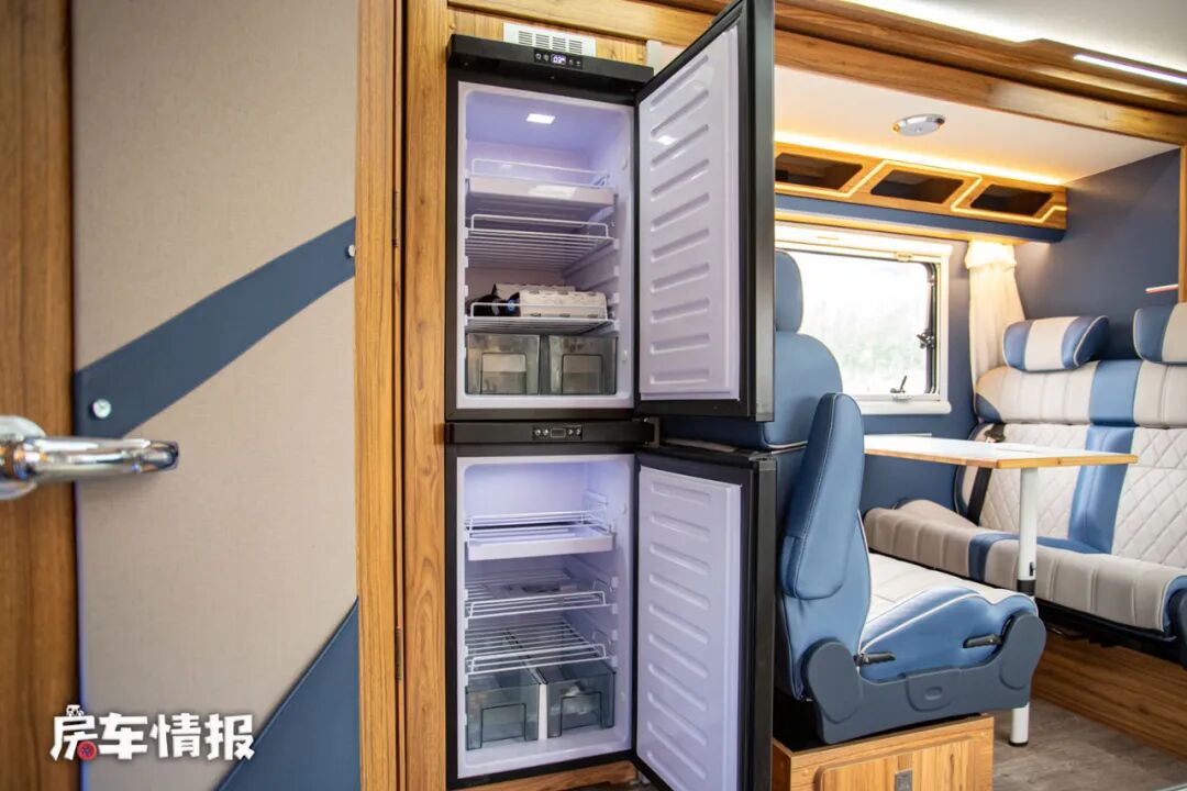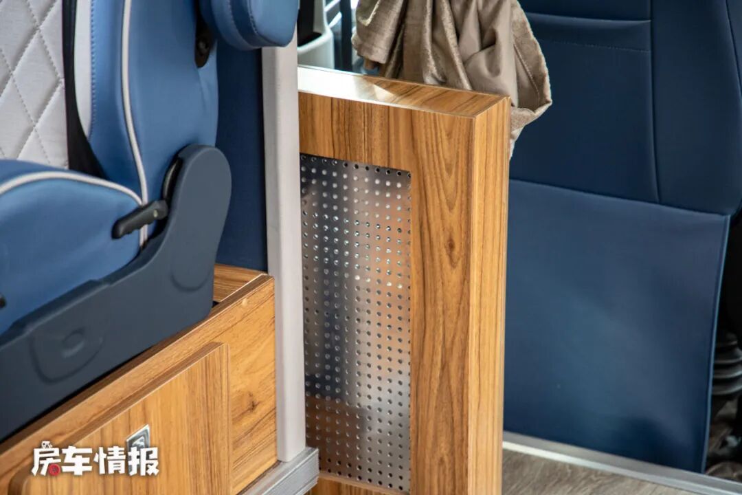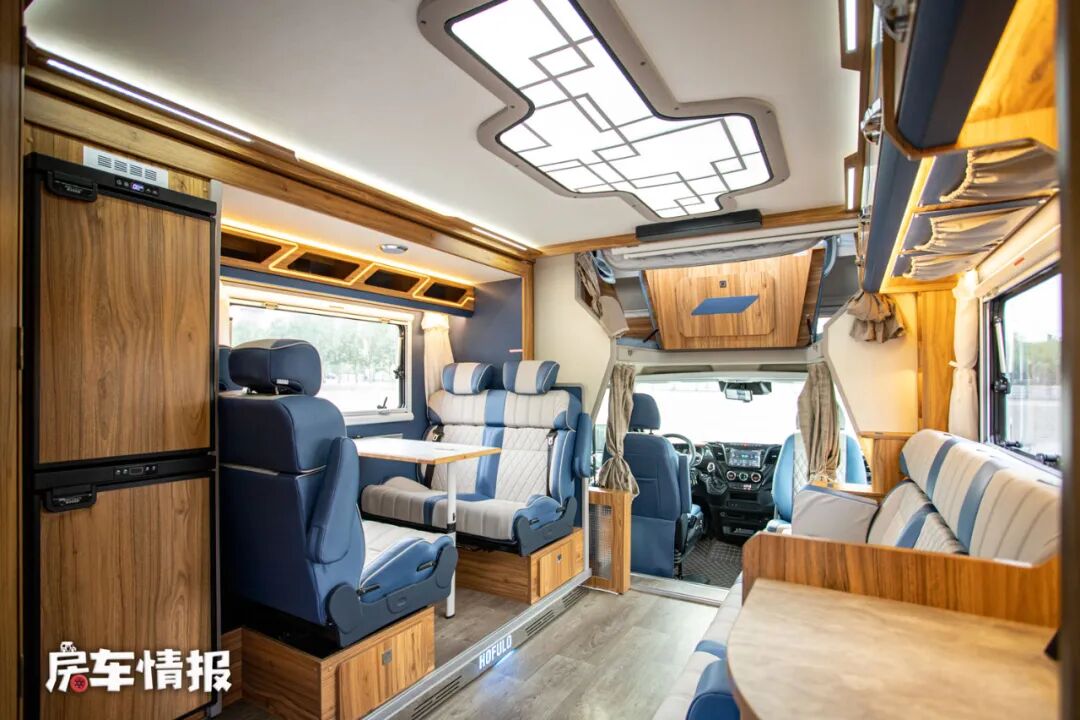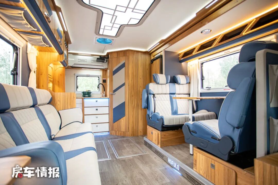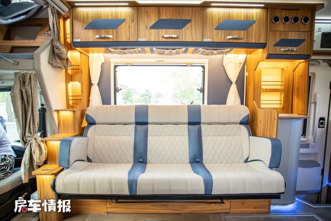 这款车是采用了后入门的设计,进入车厢内部,车内的设计显得很有高级感,原木色的家具面板配上莫兰迪蓝色的墙壁彰显了整体的格调。