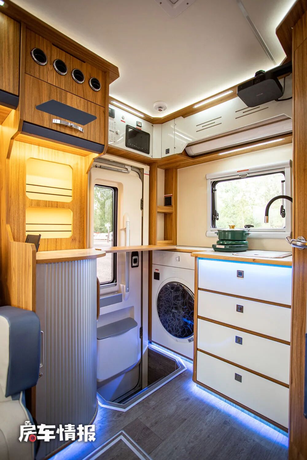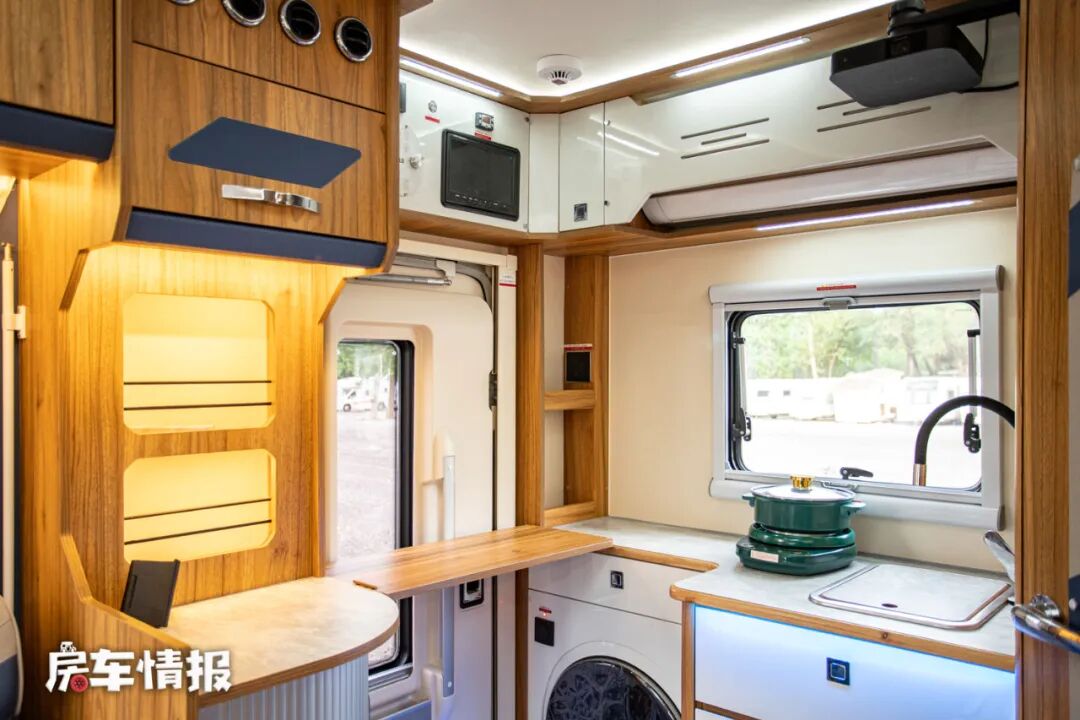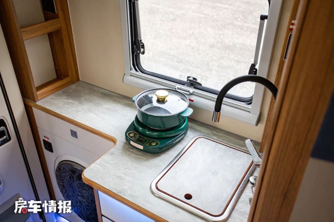 那么后入门的设计也匹配了后置厨卫区的设计,临近乘客门处是全车厨房操作台,操作台整体的尺寸还是不错的,侧面还带有翻折的小桌板,可以用来备菜使用。台面上提供了水槽和可移动的电陶炉,下方则嵌入了一台3kg洗烘一体机,上方顶部还提供了一台1.5匹的家用变频空调,可以为车内提供一个舒适的居住环境。
