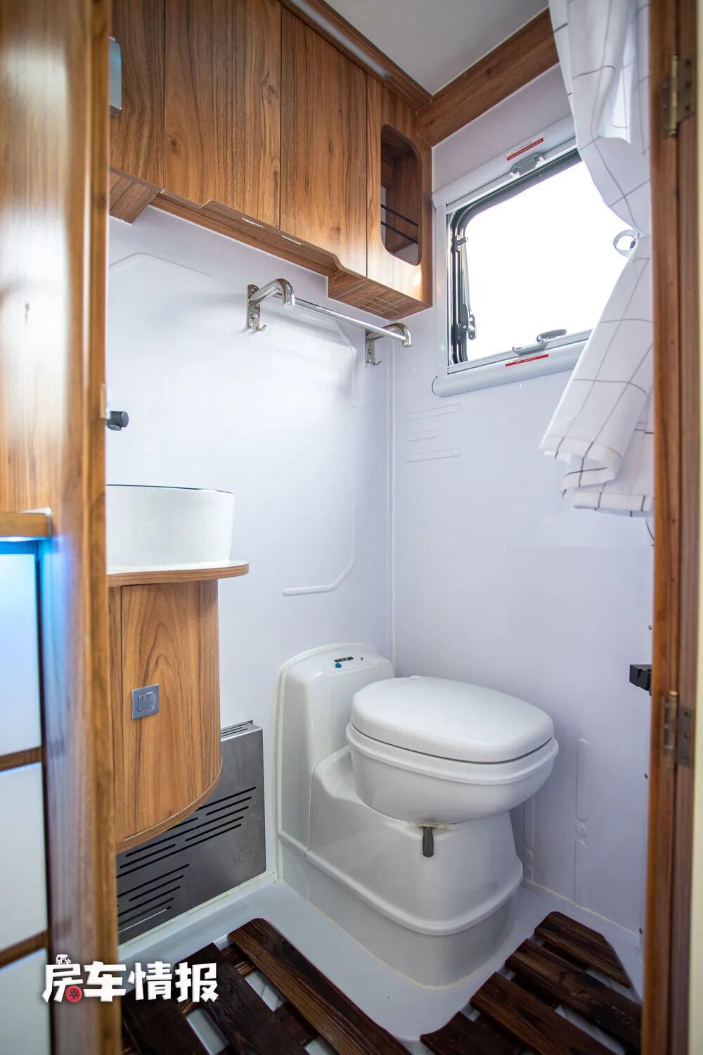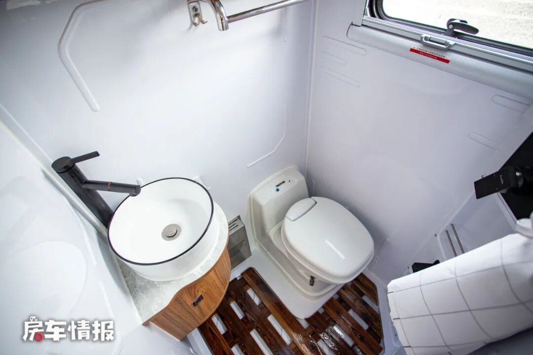 内侧则是全车的卫浴室,采用了一体吸塑式的设计,可以防潮防水延长整体的使用寿命,内部空间也还不错,提供了一个小型的盥洗台、可旋转的盒式马桶、淋浴花洒等,可以满足日常的洗漱需求。