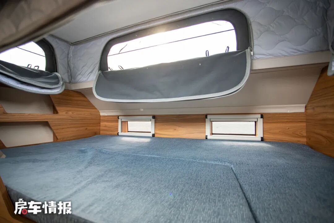 除了可变床的会客区外,在驾驶室顶部的额头区内则提供了一张固定的额头床,得益于额头带升顶的设计,整个额头区的内部高度可以达到1米,床铺也可以达到1950*1200mm,可以满足两个人的睡眠休息需求。