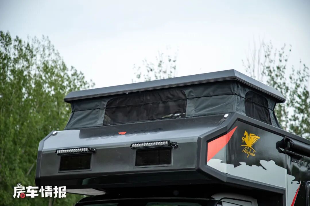 最特别的也就是刚才我们所说的,这款车带有一个特别有意思的升顶机构,就位于车顶额头区域,虽然说市面上也有一些额头带升顶的车型,但是这个升顶是采用了直立升降的方式,这样可以保证内部前后的空间基本能够保持一致,为后期使用提供了更宽敞的空间,另外升顶机构通过遥控就能够操控,使用起来是相当的便利。