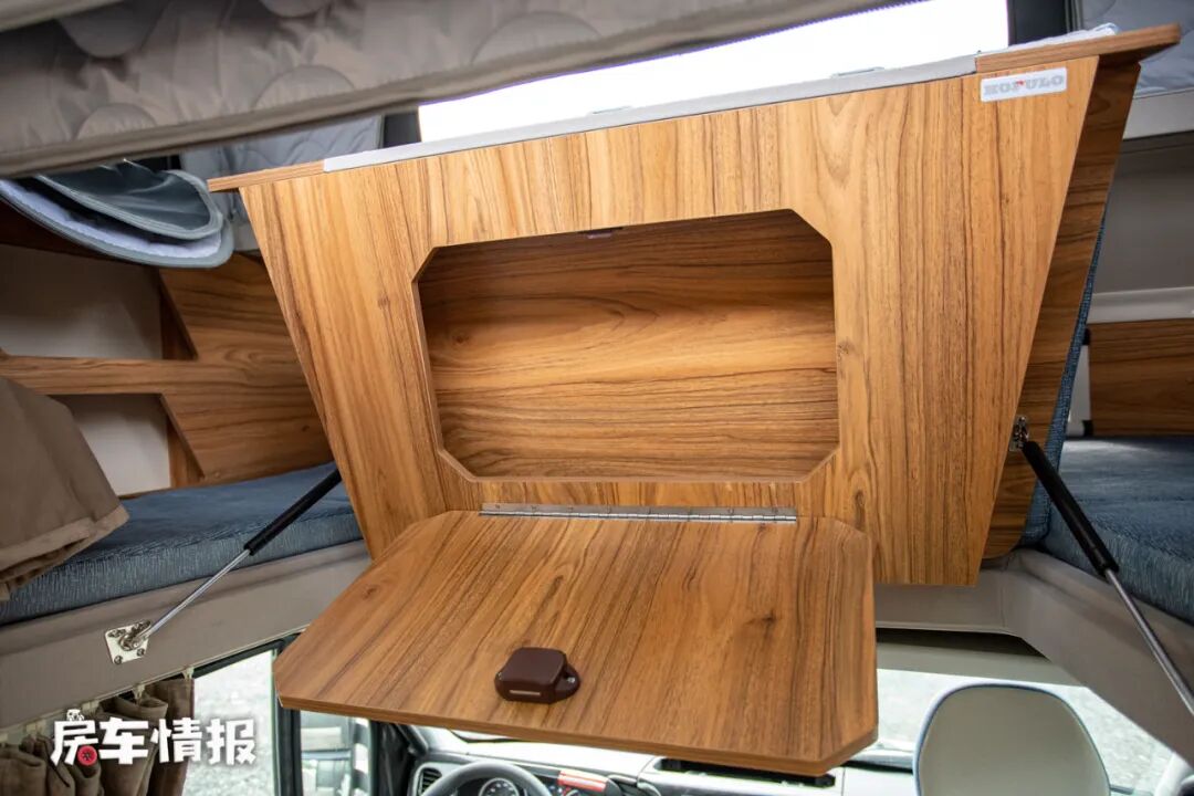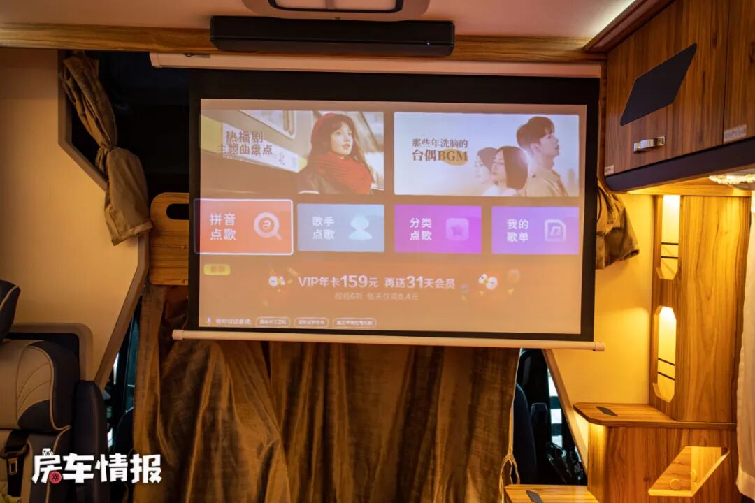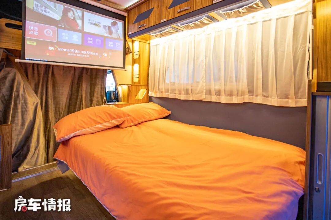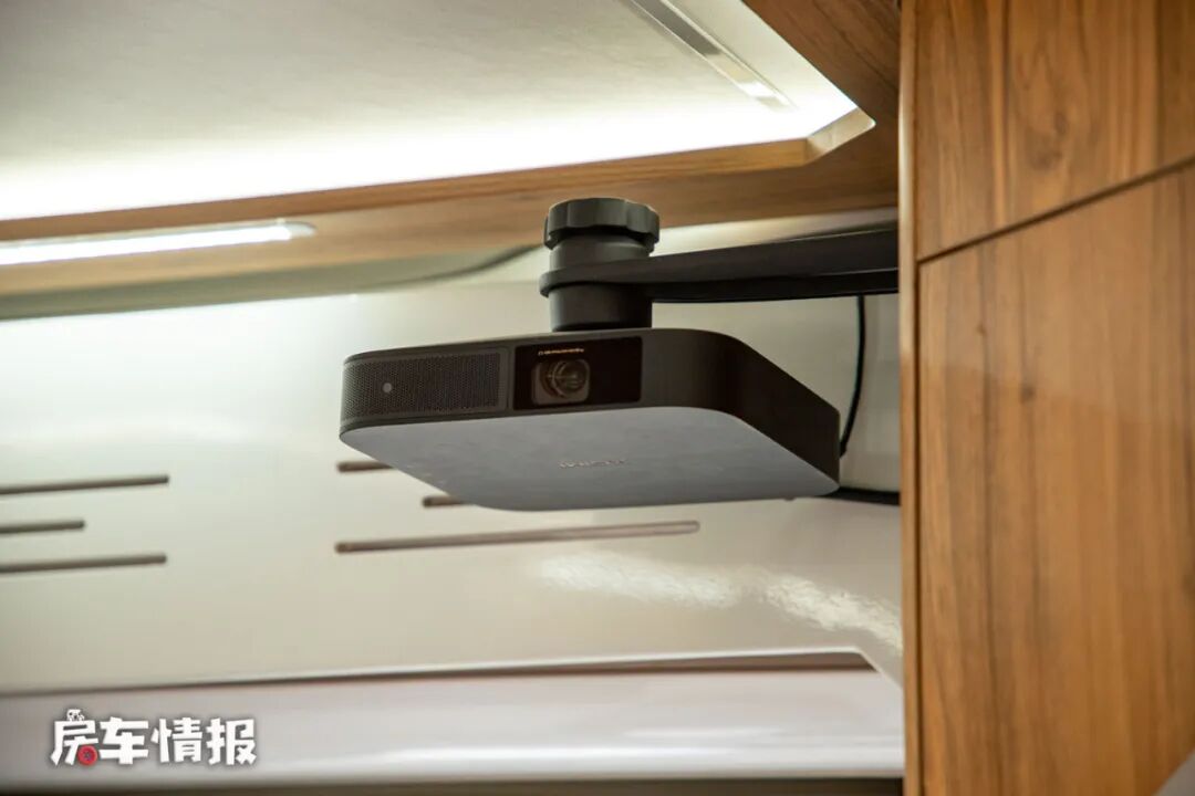 床板下方取消了常见的电视,改为了储物空间,而在娱乐影音方面,这款车是提供了投影机和幕布,这样在夜晚的时候也能打造一个小型的私人电影院,享受休闲惬意的时光。