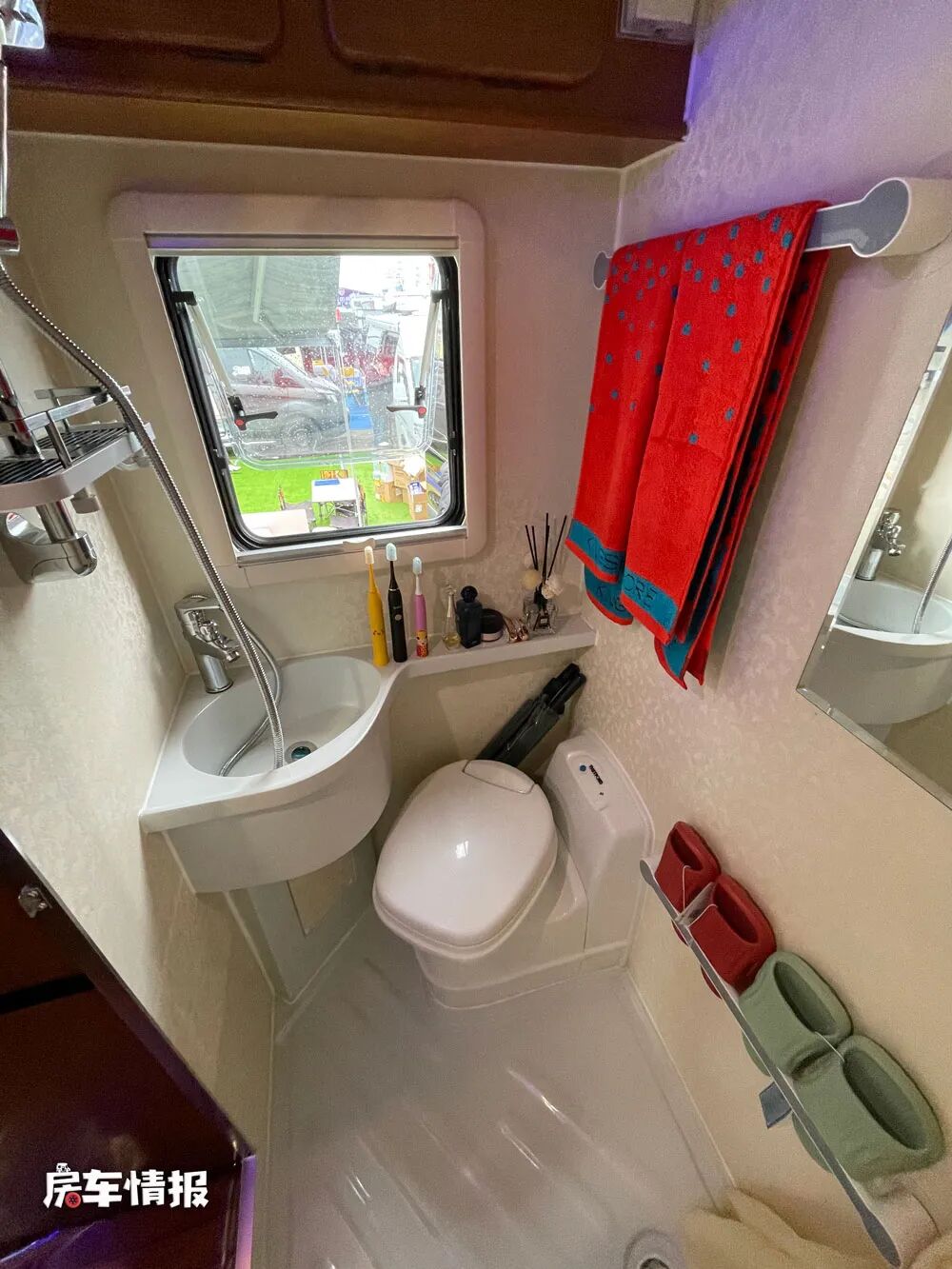 车厢尾部是一间独立的卫浴室,空间也还可以,内配也比较齐全,包括马桶、淋浴花洒、洗手台、换气扇、毛巾架和储物吊柜等洗漱设施,完全可以满足出行在外的洗漱需求。