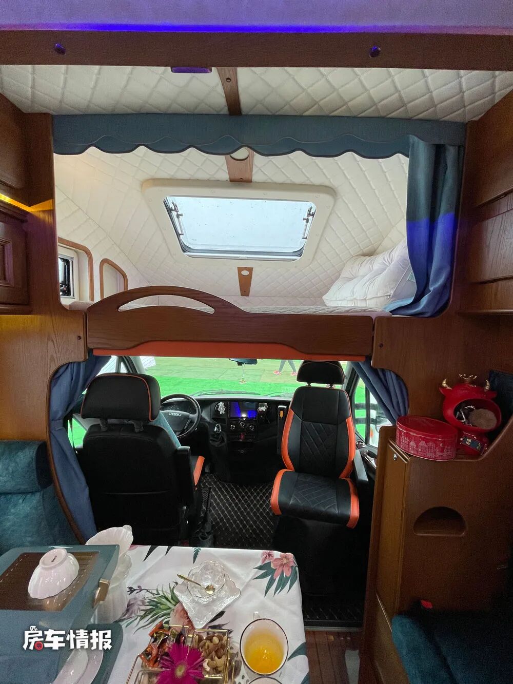 除去尾床之外,在前方驾驶室上方的额头区域内,还提供了一张双人额头床,也可以容纳两个成年人睡觉休息使用,额头区内全部采用了软包的设计,可以防止平时磕碰头,另外额头床三面环窗,既保证了采光量,也可以通风换气用。