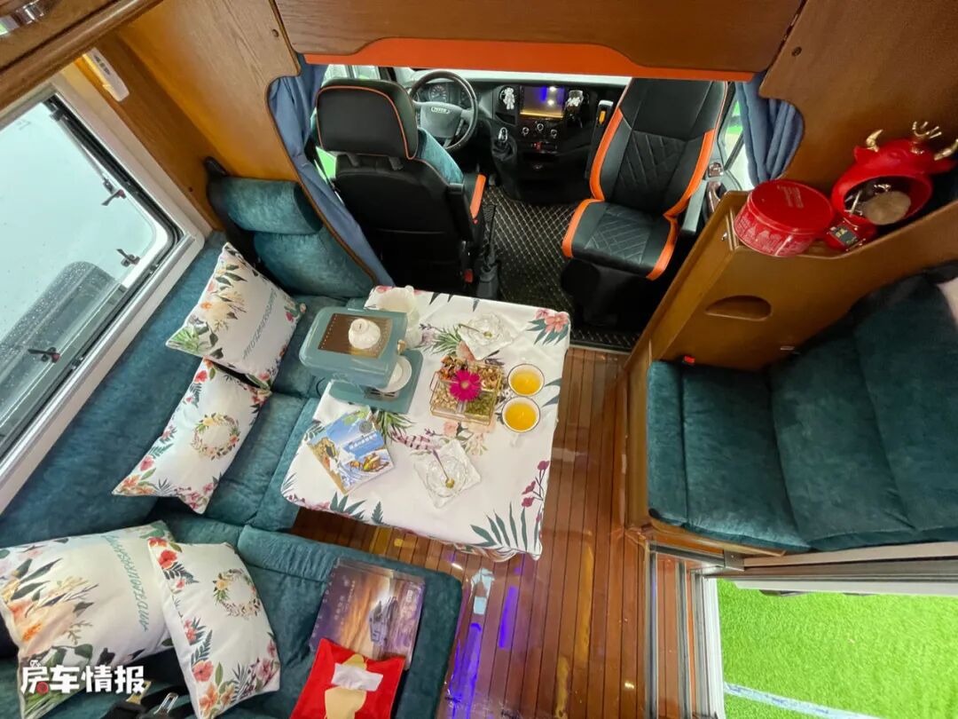 另外这款房车还提供了其他两种布局,其中一种是将墨绿色的沙发变更为米拼橙色的配色,整体感觉更加的时尚年轻。