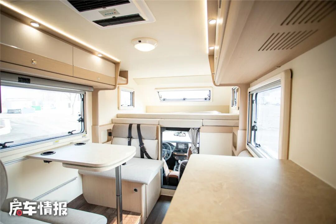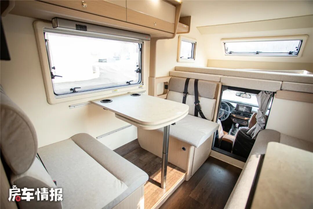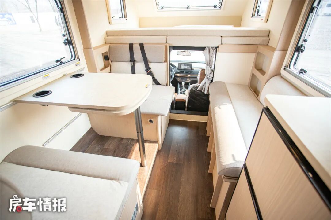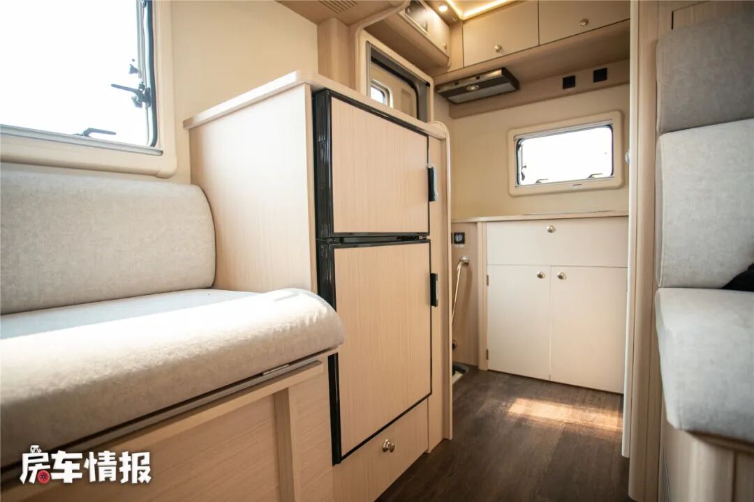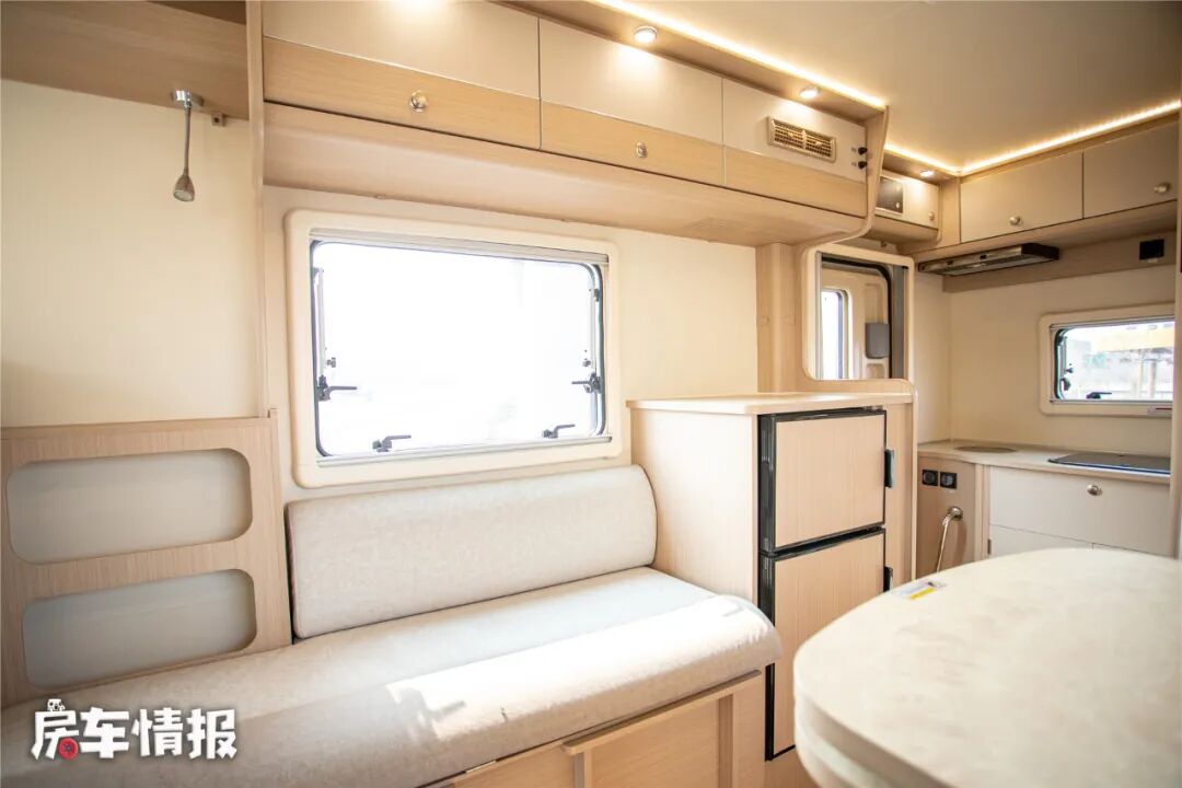 车厢中部的会客区采用对卡座沙发+条形沙发的设计,是不是和后入门的依维柯C型房车一样?只不过这里的尺寸都要小了一些而已!