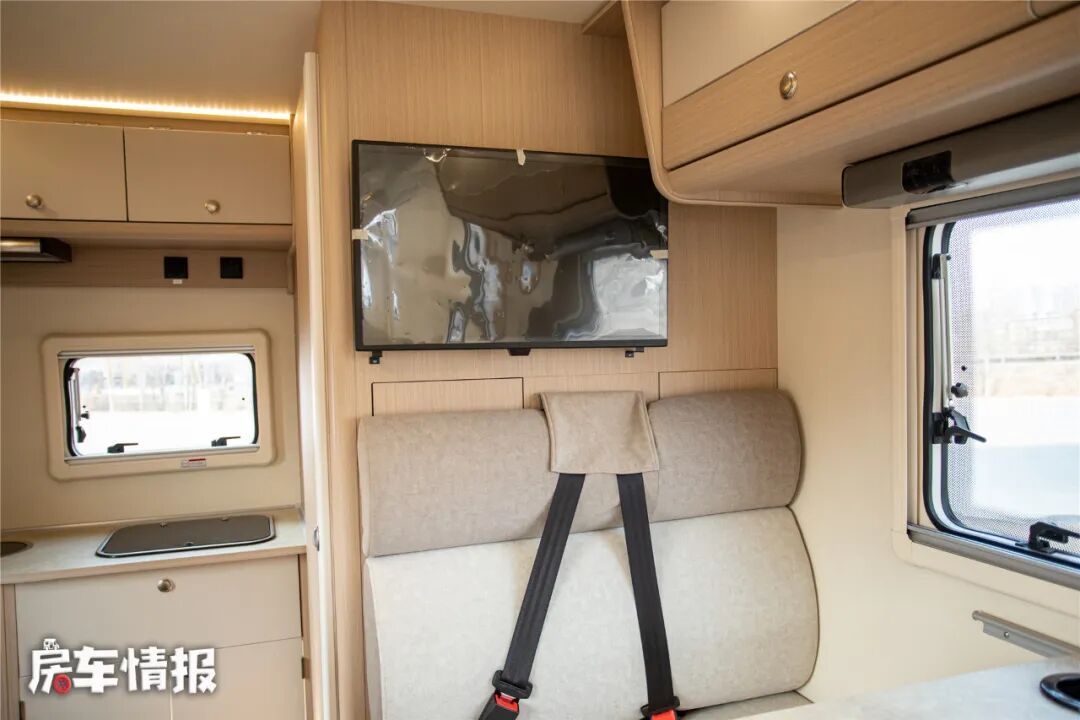 四人对卡座沙发,尺寸挺大,腿部空间也挺不错,日常乘坐舒适性可以得到保证,位于卡坐沙发后方提供了一台24寸液晶电视,虽然尺寸不大,但旅行中看看新闻也是没问题的,在储物吊柜的下方还提供了一个“回音壁”,进一步提升了音响的品质。