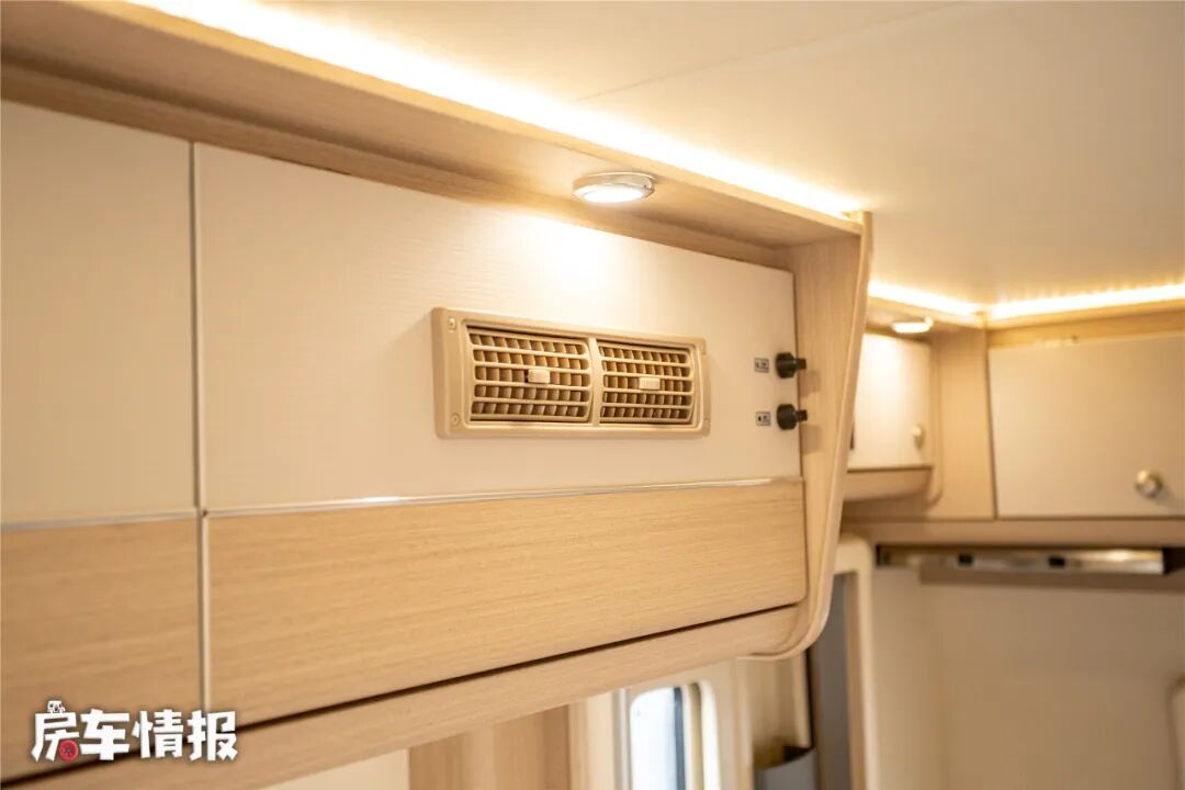 位于驾驶室顶部是一张大尺寸的额头床,尺寸达到了1900*1900mm,可以轻松睡下一家3口人,这样大的尺寸,放在现如今新推出的房车里,也可以说是罕有对手!得益于车顶部较为方正的造型设计,这样大床的内侧和外侧都不会让你感到压抑。
