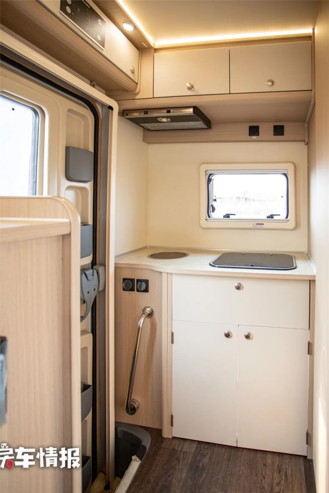 车厢尾部是厨房和卫生间所在的位置。厨房的尺寸不是很大,尾部提供了电磁炉、洗菜池、抽油烟机等,另一侧则提供了一台房车专用冰箱,上方还带有行车空调。