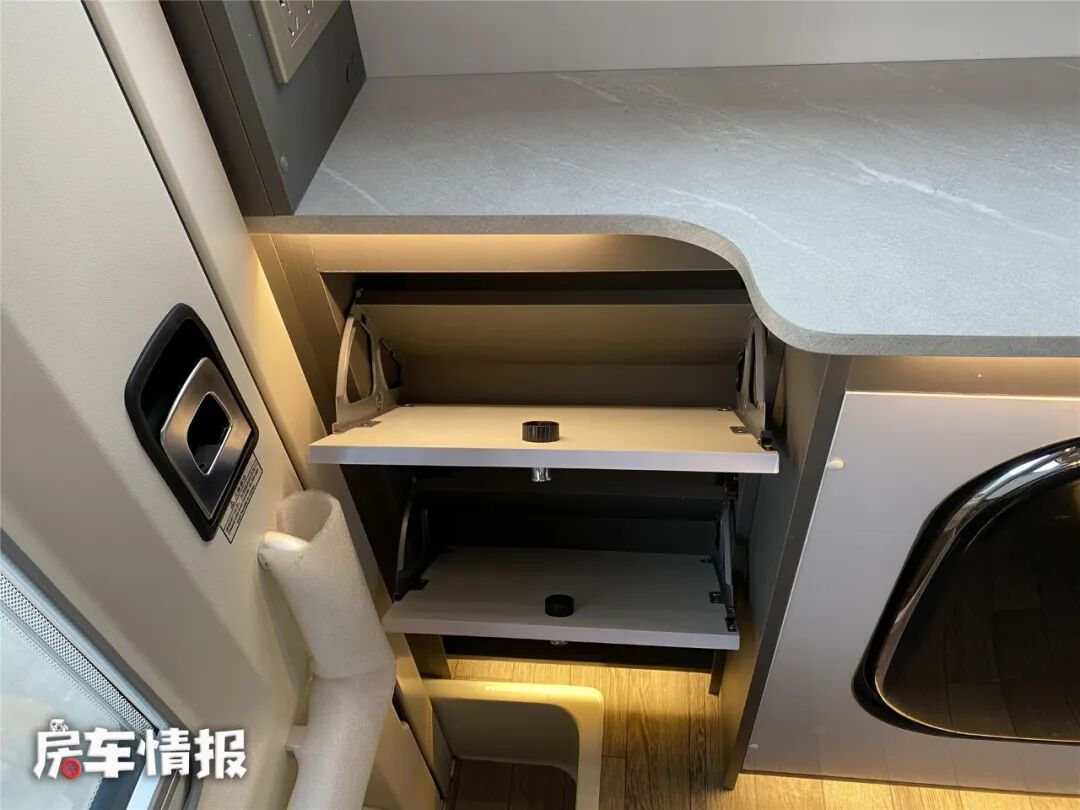 车尾部被打造成了一个超大的独立厨房,通过内侧的推拉门,可以将这里隔断成一个独立封闭空间,为了满足厨房内有足够的活动空间,厨房的纵深向内延长,比常规后入门车型的尾部厨房都要大了不少。