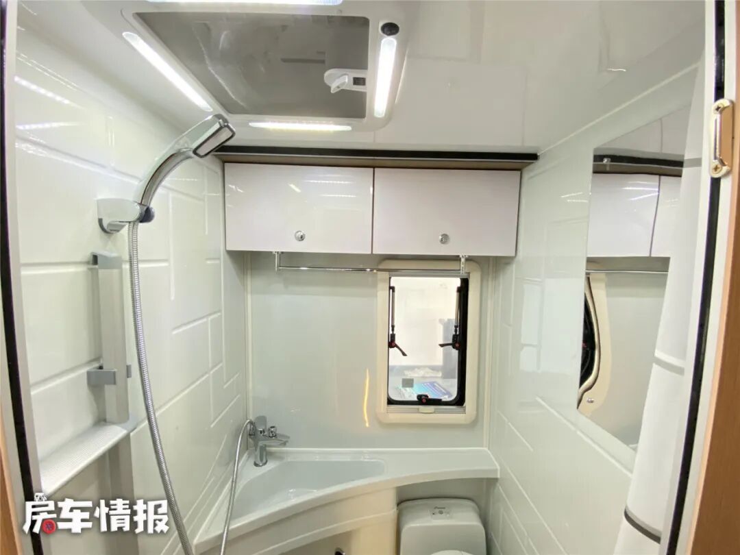 卫生间内部空间也挺大,带有盒式马桶、淋浴花洒、换气扇等,另外搭配车内提供的全新5kW燃油暖风热水一体机和260L超大防冻保温净水箱、80L灰水箱,不费电不等待,旅行中也能舒舒服服地洗热水澡。