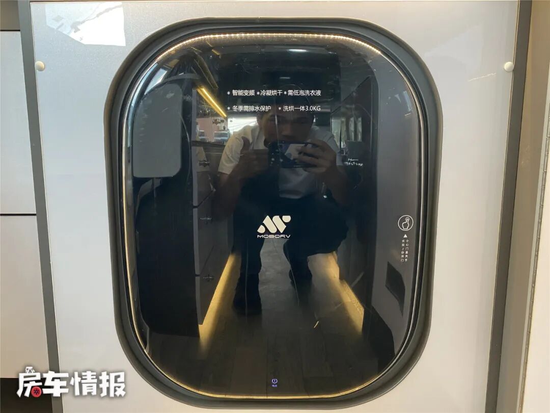 尾门后方的位置则变成了一个置物平台,平时上车以后可以把一些随身物品放在这里,做饭的时候也可以备菜使用,下方则是一台大宇洗衣机。