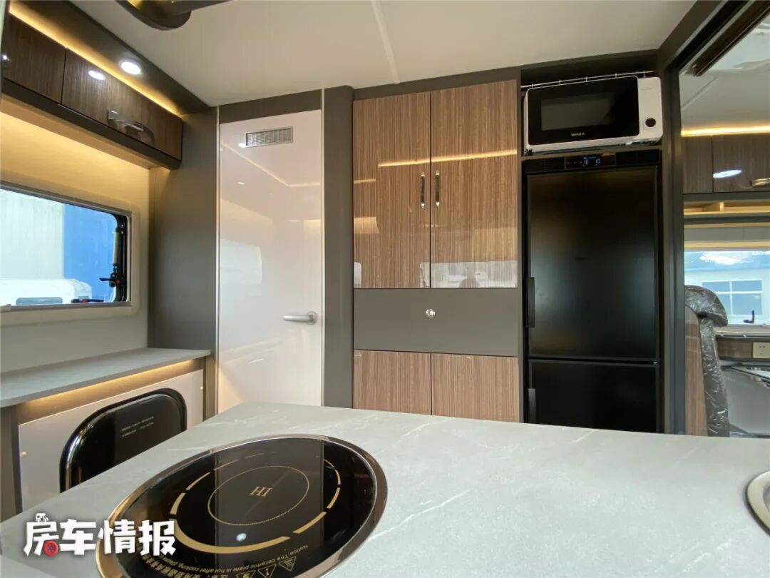 位于厨房内侧,则提供了独立卫生间、储物柜以及152L的房车专用冰箱和微波炉,整体化设计比较规整,看起来有点高端定制家具的感觉。