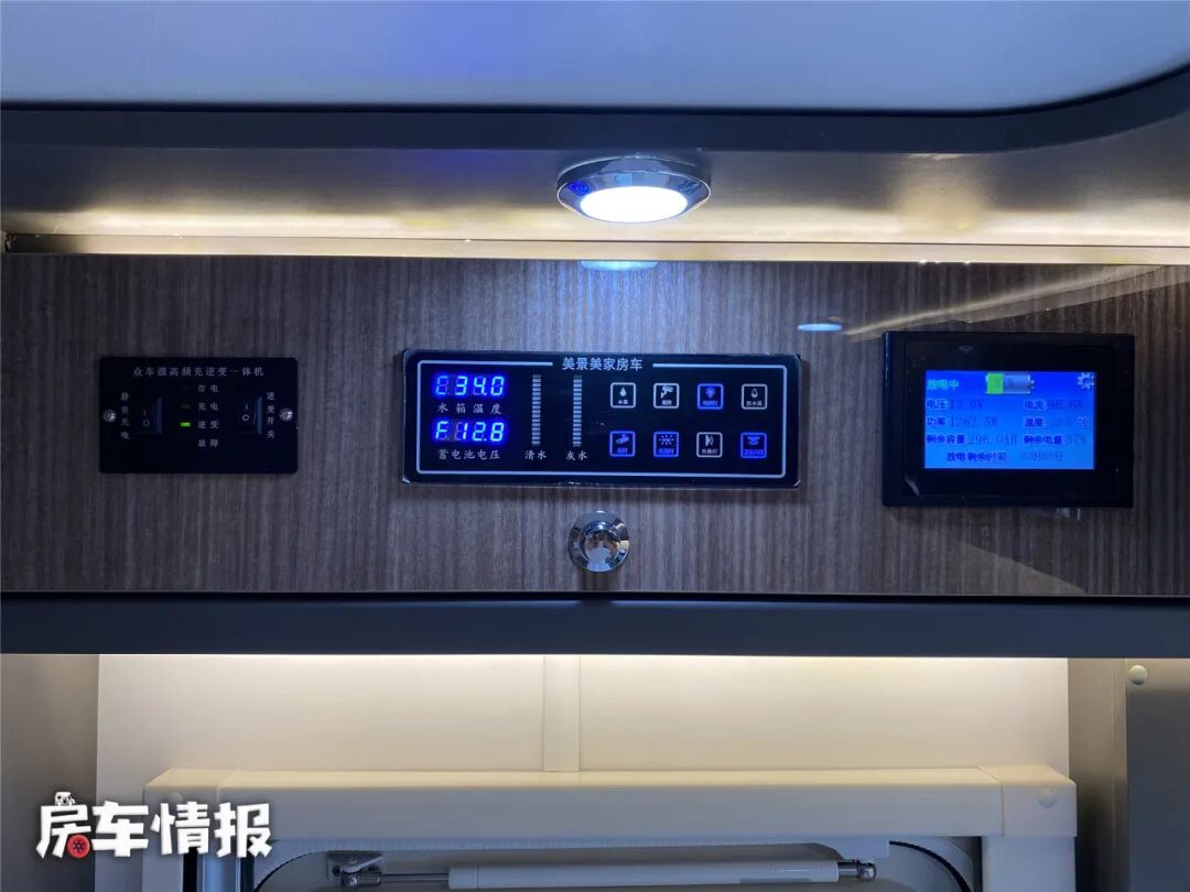 电力系统方面,这款车也很有看点,整车标配3000W逆变器、1000Ah锂电池(相当于12度电)、1100W的如果新能源太阳能电池板,采用单晶硅足功率的太阳能电池板可以为房车电力提供更多保障,另外还提供5年质保服务。另外底盘带有150A双发电机,配合独家开发的双发并网发电系统,行车状态最多一小时可以补充3.5度电,外出旅行真的可以做到用电无忧;如果对这还不满足,还可以选择高配车型,提供了1200Ah锂电池和1900W电动伸缩+固定太阳能板。