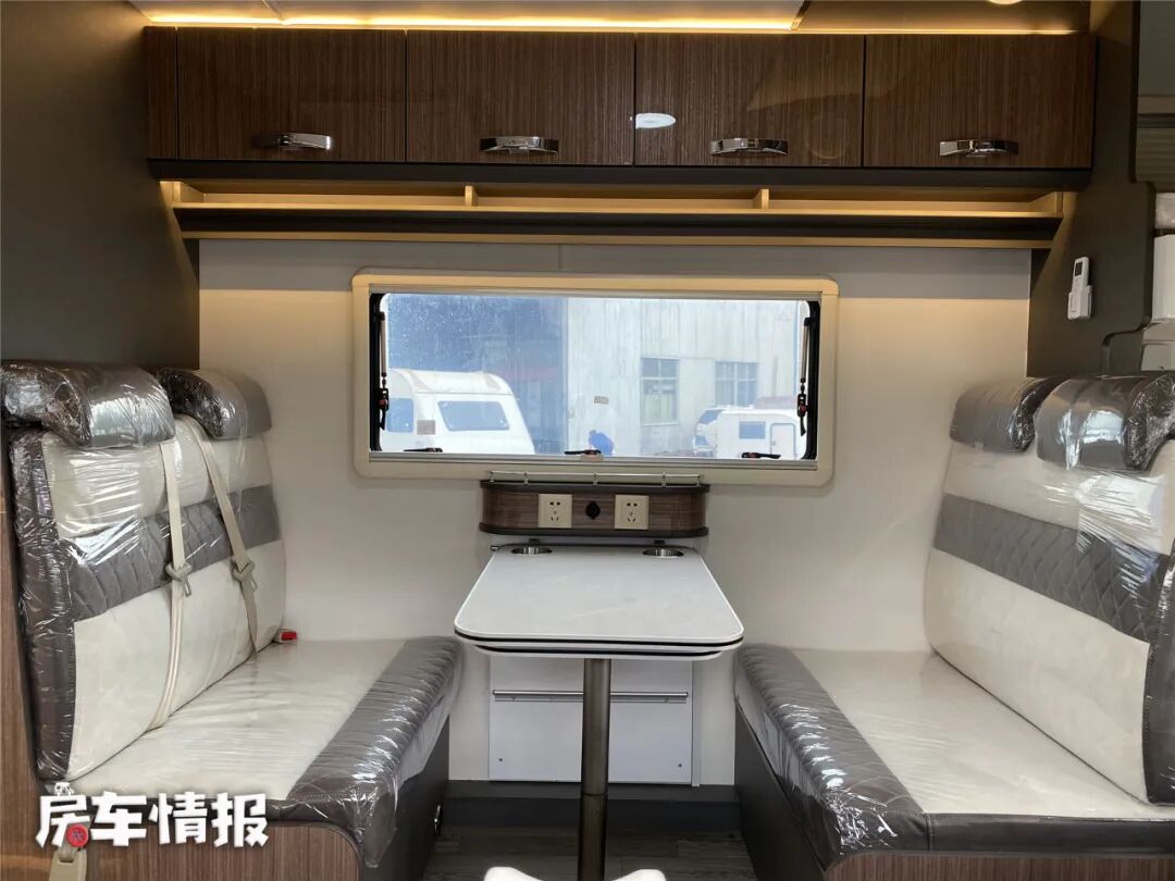 客厅和主流的后入门车型设计一样,一侧为四人对卡座沙发,另一侧是三人连排沙发,行车中三人沙发不可乘坐,只能在有安全带的对卡坐沙发乘坐。