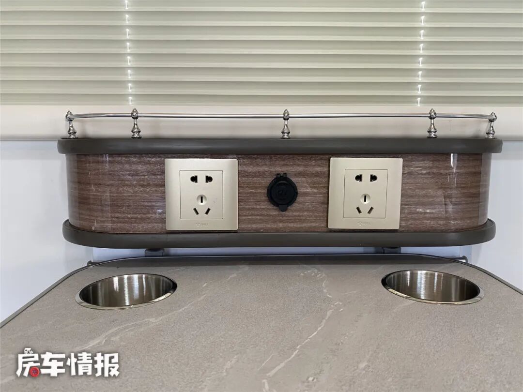 位于四人对卡座沙发内侧,提供了一组储物盒以及充电插口,便于在行车中为随身设备充电。