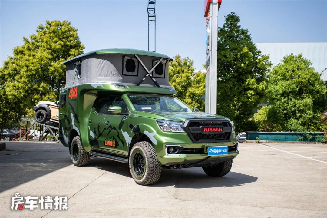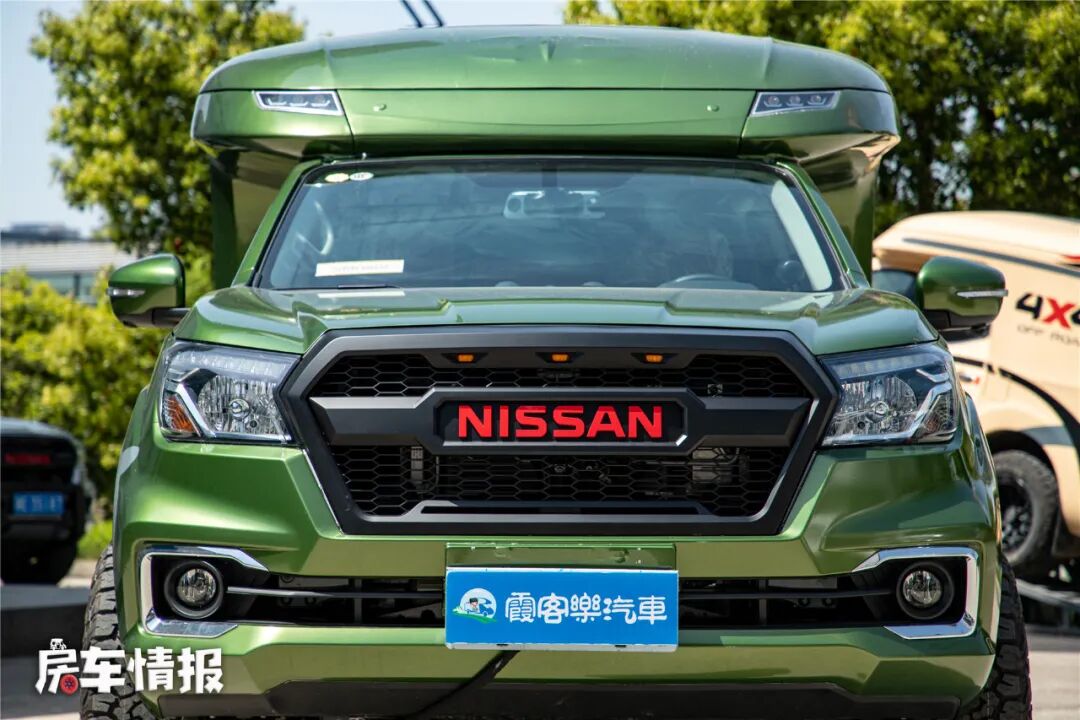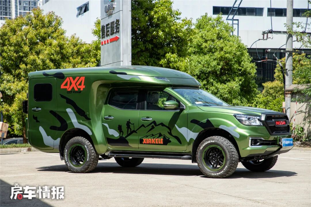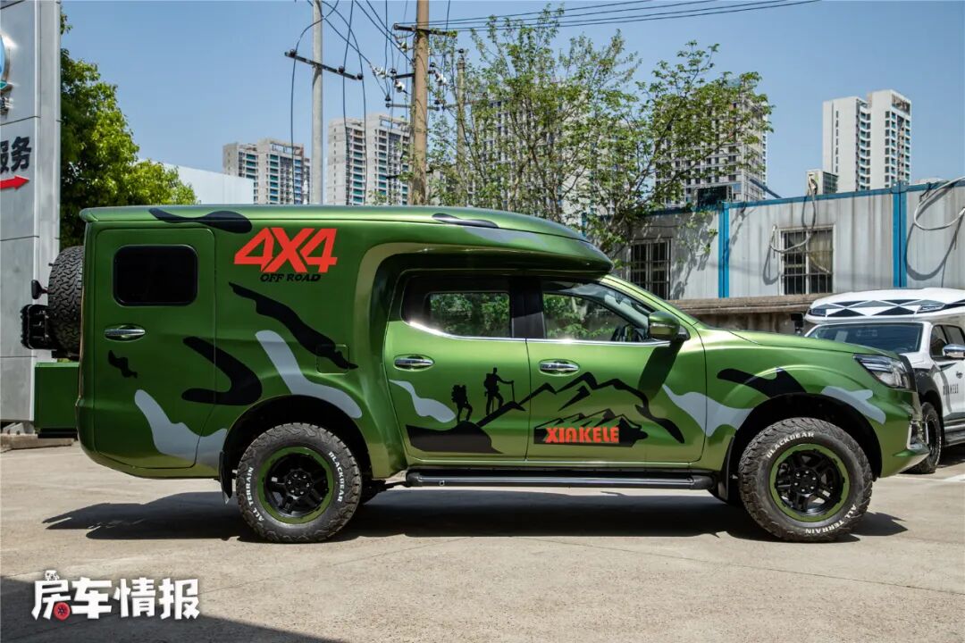 丛林绿的车身涂装搭配定制的尼桑黑化中网,让这款车看起来野性十足,四条全地形越野胎更是提升了整车的下盘视觉冲击力,另外在户外穿越的时候,越野胎也具有更好的防刺穿和抓地性。
