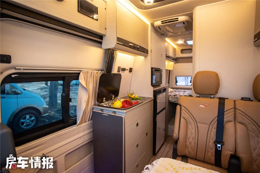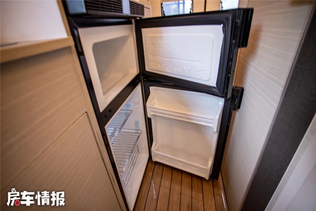 位于双人座椅下方,还巧妙地加入了一台30L的抽屉式房车专用冰箱,一些必要的食材或者饮料都可以放进去。