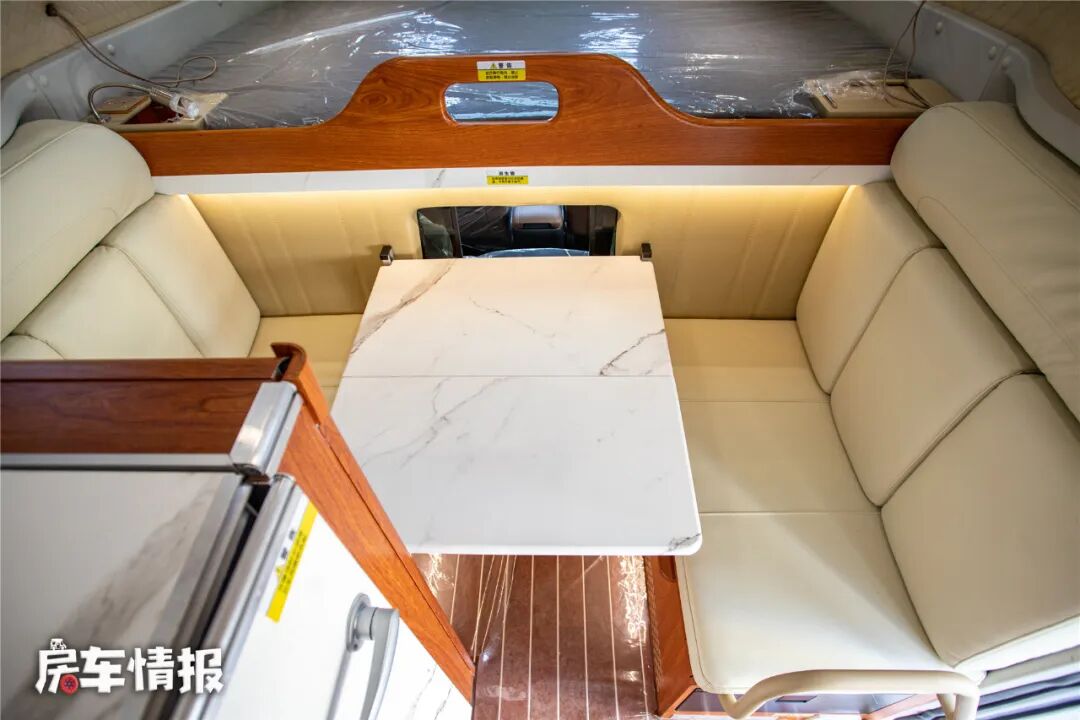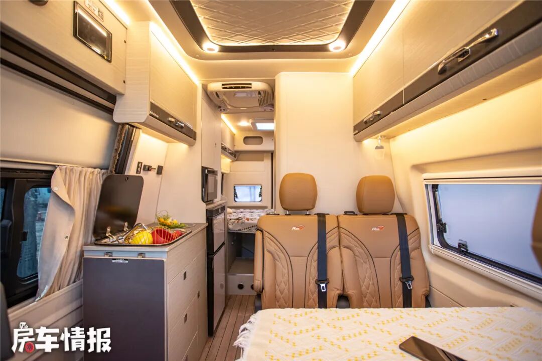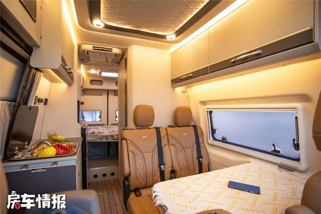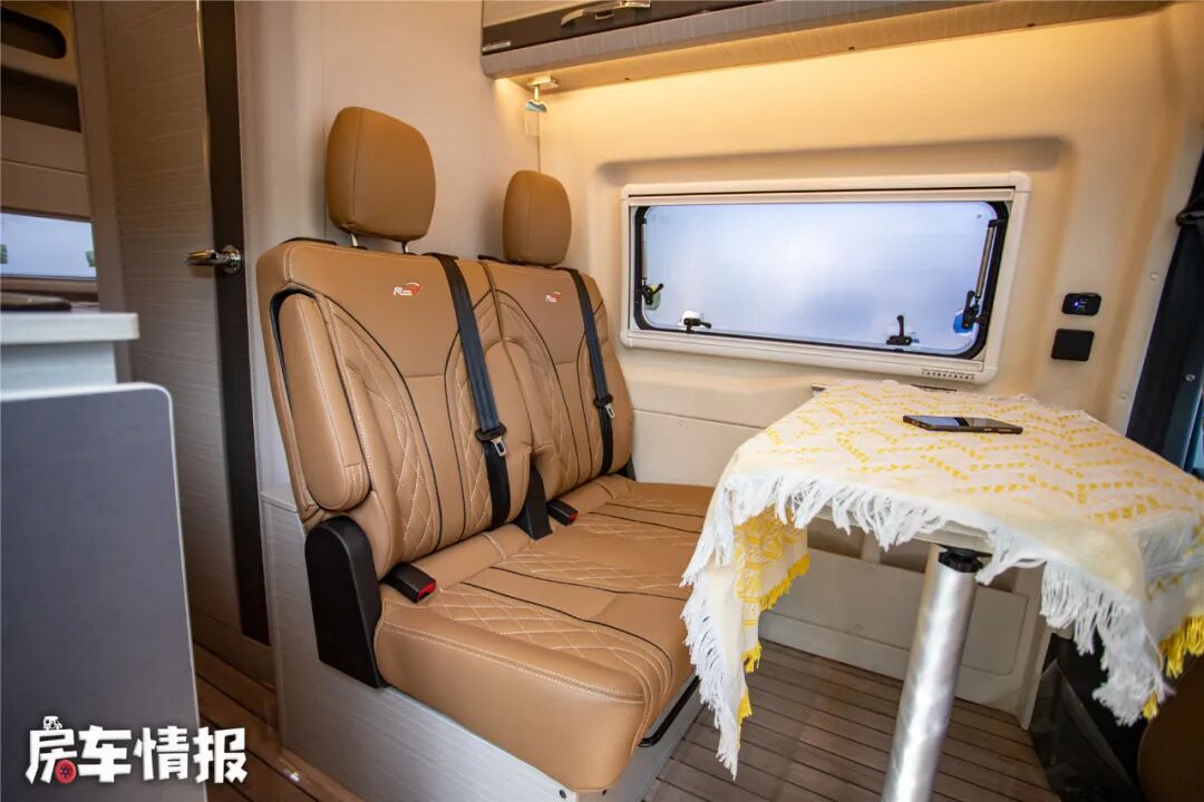 生活区的设计同样有自己的特点,全车采用航空级吸塑件、零软包处理,从根上就杜绝了甲醛的出现,非常环保!车厢内部采用四座设计,可选5座,四个座椅的乘坐舒适性都很不错,后排双人座椅直接与大梁相连接,当发生意外时,安全性更好。
