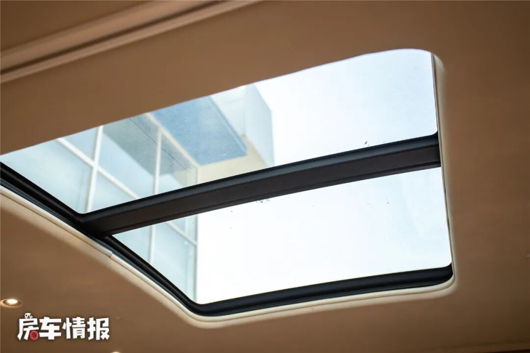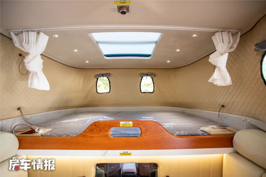 顶部还提供了一部乘用车上的使用的全景天窗,驻车以后可以分段开启,开启方式和普通家用车完全一致;在床铺的外侧还提供了小尺寸的储物盒、阅读灯以及插座,提升使用的便利性。