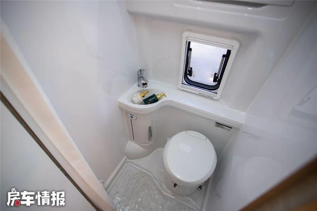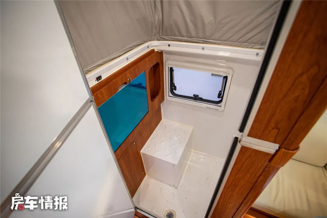 由于采用的升顶设计,车内卫生间也采用了翻折墙体的设计,在使用的时候将墙体翻折打开,就变成一个独立封闭式卫生间里,这点在目前所有升顶房车里算是比较独特的。