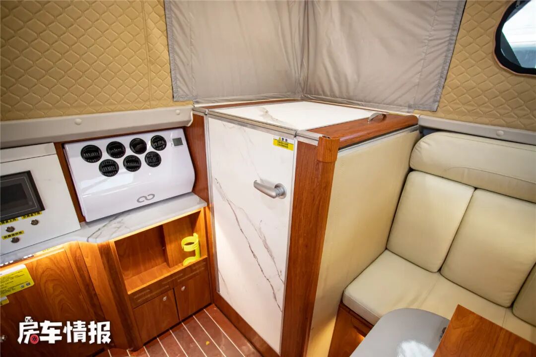 进入车厢内部前,先把升顶打开,这款车采用了一个软顶的升顶机构,可以更灵活地应对不同使用场景。打开车顶后,内高达到了1.95米,成年人可以轻松站立,车顶连接出采用的多层软性材质,防风、隔热、保温,基本上可以保证车内的一个舒适性。