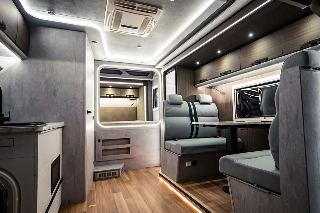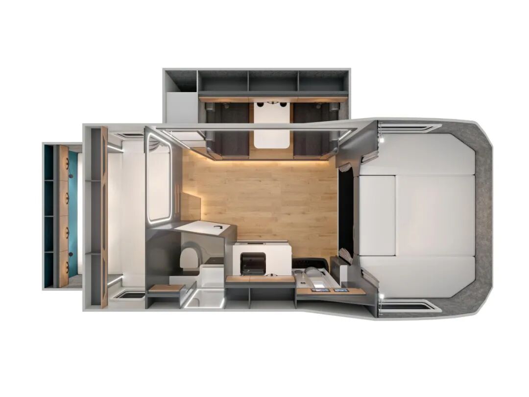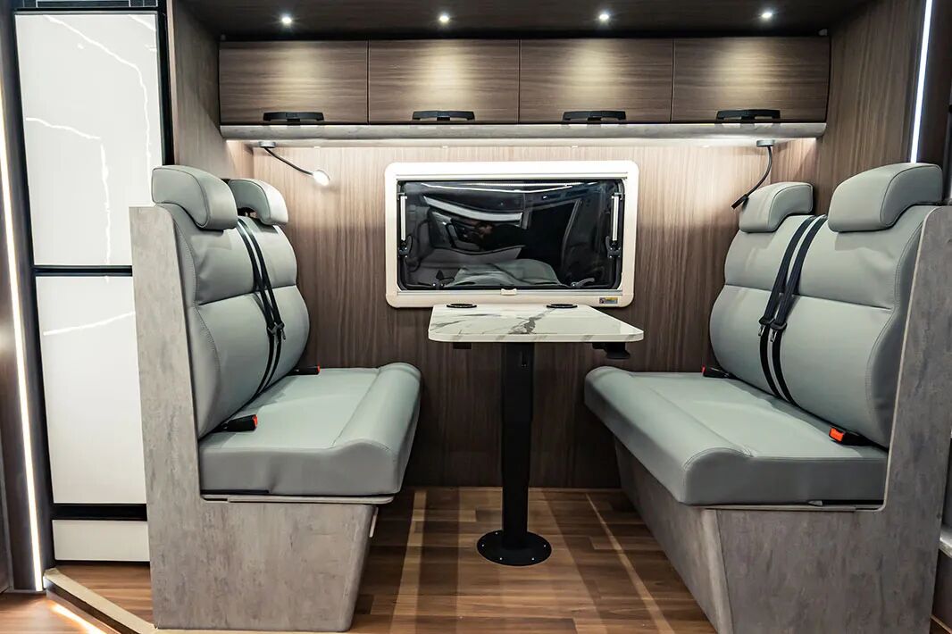大福房车的前置额头床尺寸达2140mm×1550mm,可以轻松容纳两个成年人,独特的环景天窗,美景尽收其中。客厅区的卡座位置可拼接成一张1860mm×1000mm的床铺。尾部可拓展床位最大尺寸2250mm×1300mm,宽阔的睡卧空间可以满足4-6人。