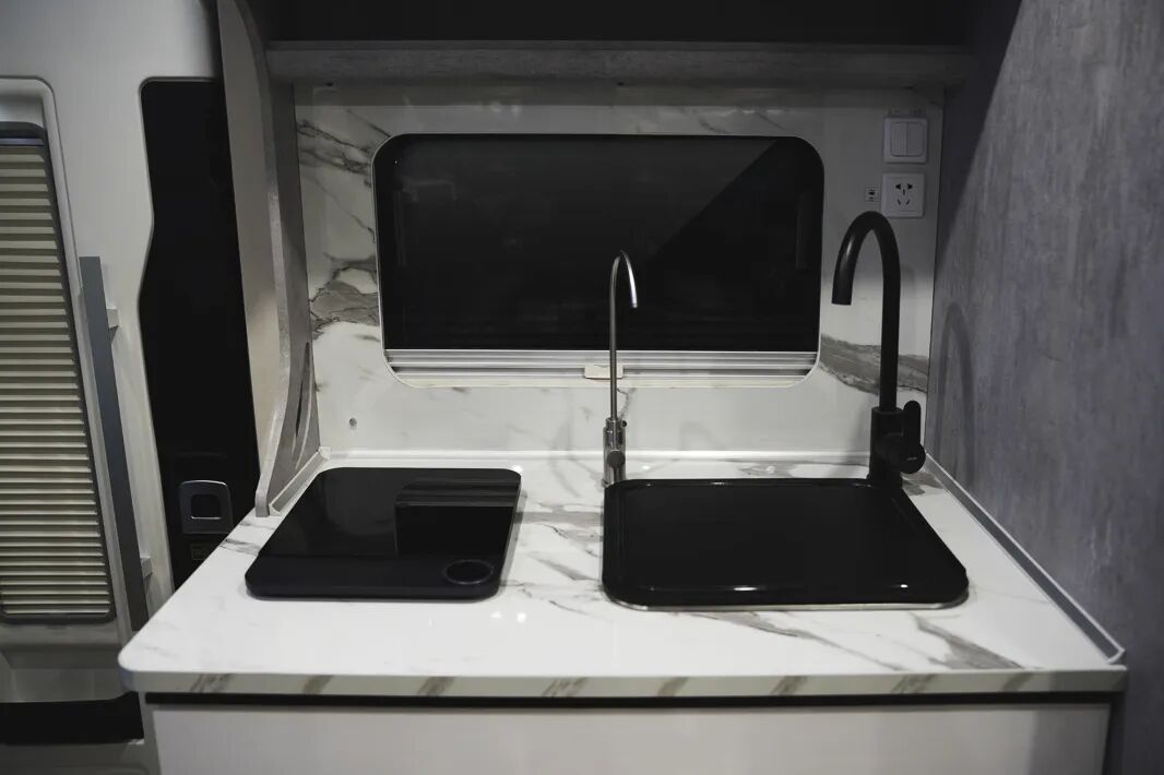 一般的户外露营,基本能满足的是基础性的吃喝问题,常常需要携带速食类食品。房车出行则全然不同,大福房车宽阔室内厨房设计,盖板洗菜池以及便携式智能电磁炉,抽屉式扩展桌板,赛特福德T2156房车专用冰箱,美的微波炉,随时随地可以做饭。同时配有户外的柴油灶。即使在条件艰苦的环境中,也能美美吃上一顿精致的饭菜。